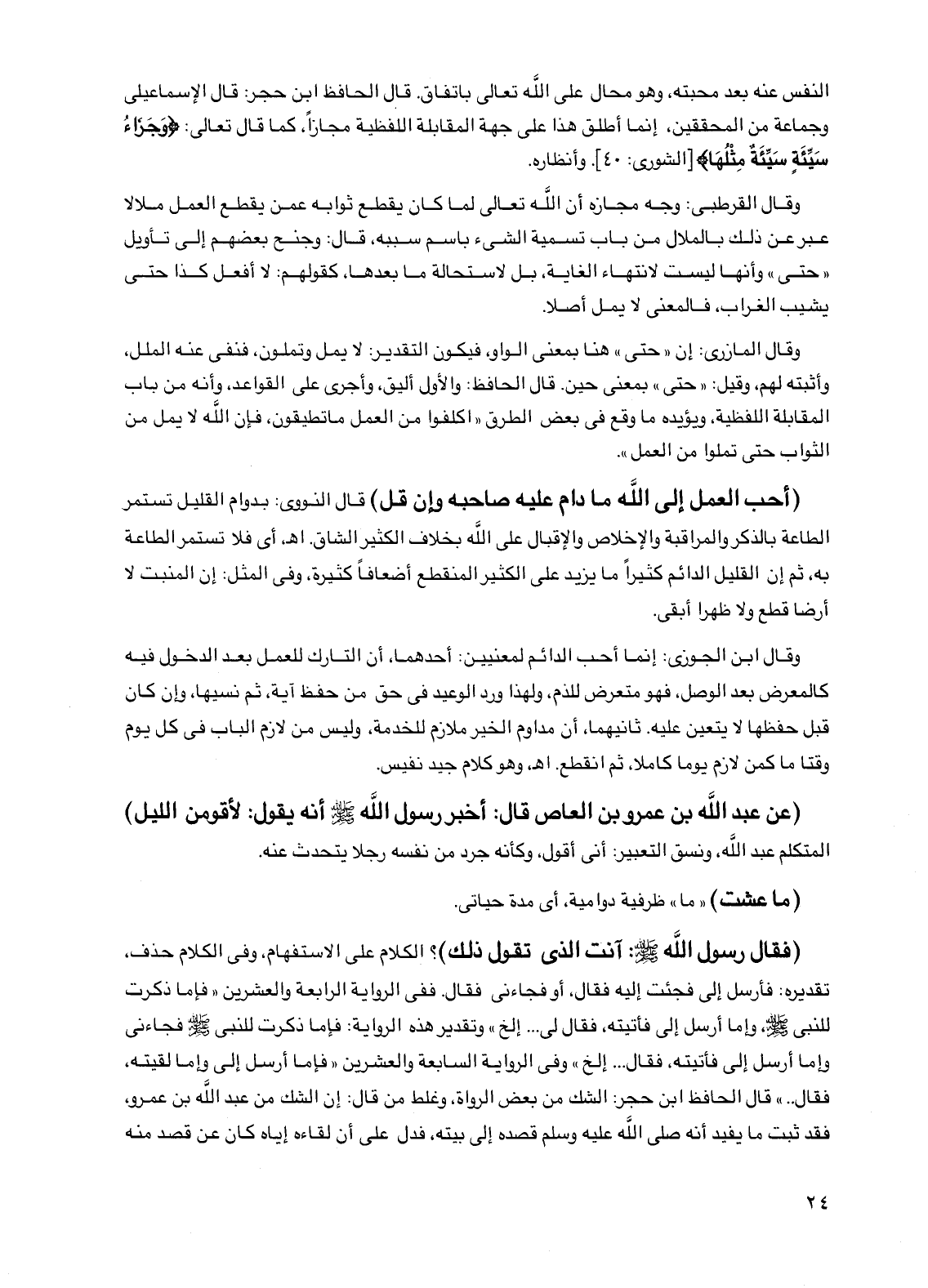 (أحب العمل إلى الله مادام عليه صاحبه وإن قل) قال النووي: بدوام القليل تستمر الطاعة بالذكر والمراقبة والإخلاص والإقبال على الله بخلاف الكثير الشاق. اهـ أي فلا تستمر الطاعة به، ثم إن القليل الدائم كثيراً ما يزيد على الكثير المنقطع أضعافاً كثيرة، وفي المثل: إن المنبت لا أرضاً قطع ولا ظهراً أبقى.