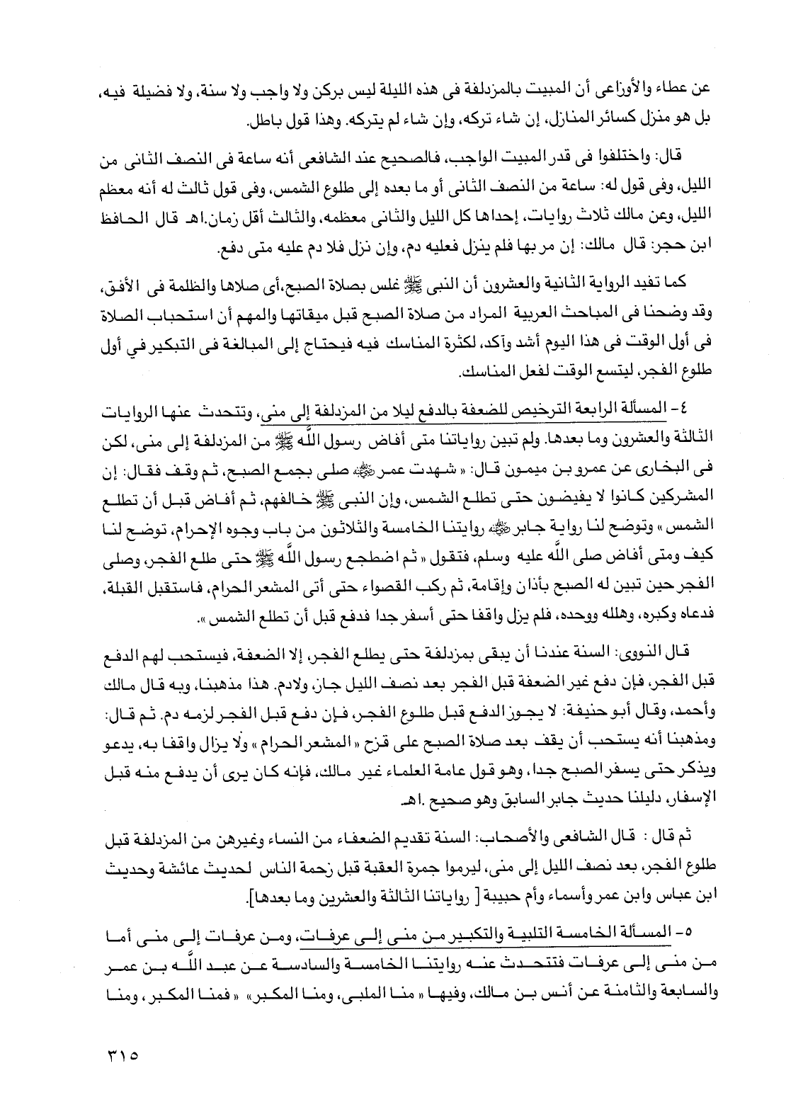 4 - المسألة الرابعة الترخيص للضعفة بالدفع ليلاً من المزدلفة إلى منى، وتتحدث عنها الروايات الثالثة والعشرون وما بعدها. ولم تبين رواياتنا متى أفاض رسول الله صلى الله عليه وسلم من المزدلفة إلى منى، لكن في البخاري عن عمرو بن ميمون قال: "شهدت عمر رضي الله عنه صلى بجمع الصبح، ثم وقف فقال: إن المشركين كانوا لا يفيضون حتى تطلع الشمس، وإن النبي صلى الله عليه وسلم خالفهم، ثم أفاض قبل أن تطلع الشمس" وتوضح لنا رواية جابر رضي الله عنه روايتنا الخامسة والثلاثون من باب وجوه الإحرام، توضح لنا كيف ومتى أفاض صلى الله عليه وسلم، فتقول "ثم اضطجع رسول الله صلى الله عليه وسلم حتى طلع الفجر، وصلى الفجر حين تبين له الصبح بأذان وإقامة، ثم ركب القصواء حتى أتى المشعر الحرام، فاستقبل القبلة، فدعاه وكبره، وهلله ووحده، فلم يزل واقفاً حتى أسفر جداً فدفع قبل أن تطلع الشمس".