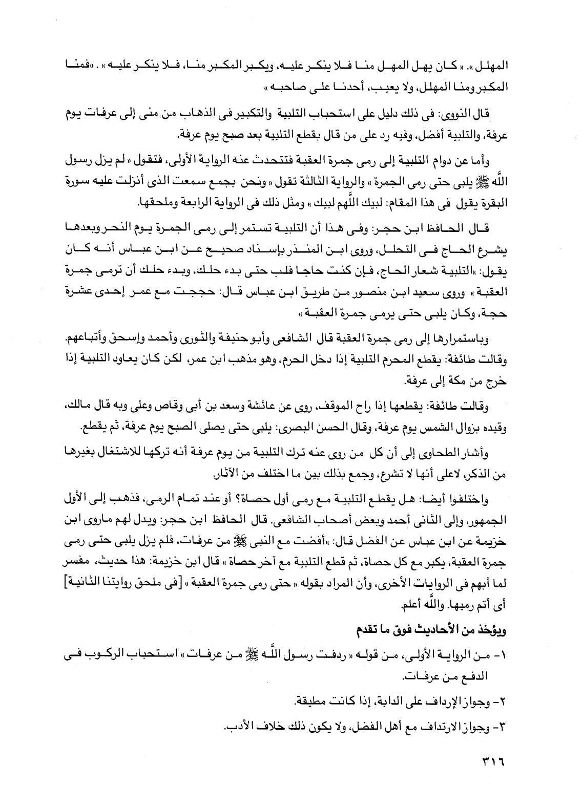 واختلفوا أيضاً: هل يقطع التلبية مع رمي أول حصاة؟ أو عند تمام الرمي، فذهب إلى الأول الجمهور، وإلى الثاني أحمد وبعض أصحاب الشافعي. قال الحافظ ابن حجر: ويدل لهم ما روى ابن خزيمة عن ابن عباس عن الفضل قال: "أفضت مع النبي صلى الله عليه وسلم من عرفات، فلم يزل يلبي حتى رمى جمرة العقبة، يكبر مع كل حصاة، ثم قطع التلبية مع آخر حصاة" قال ابن خزيمة: هذا حديث، مفسر لما أبهم في الروايات الأخرى، وأن المراد بقوله "حتى رمى جمرة العقبة" [في ملحق روايتنا الثانية] أي أتم رميها. والله أعلم.