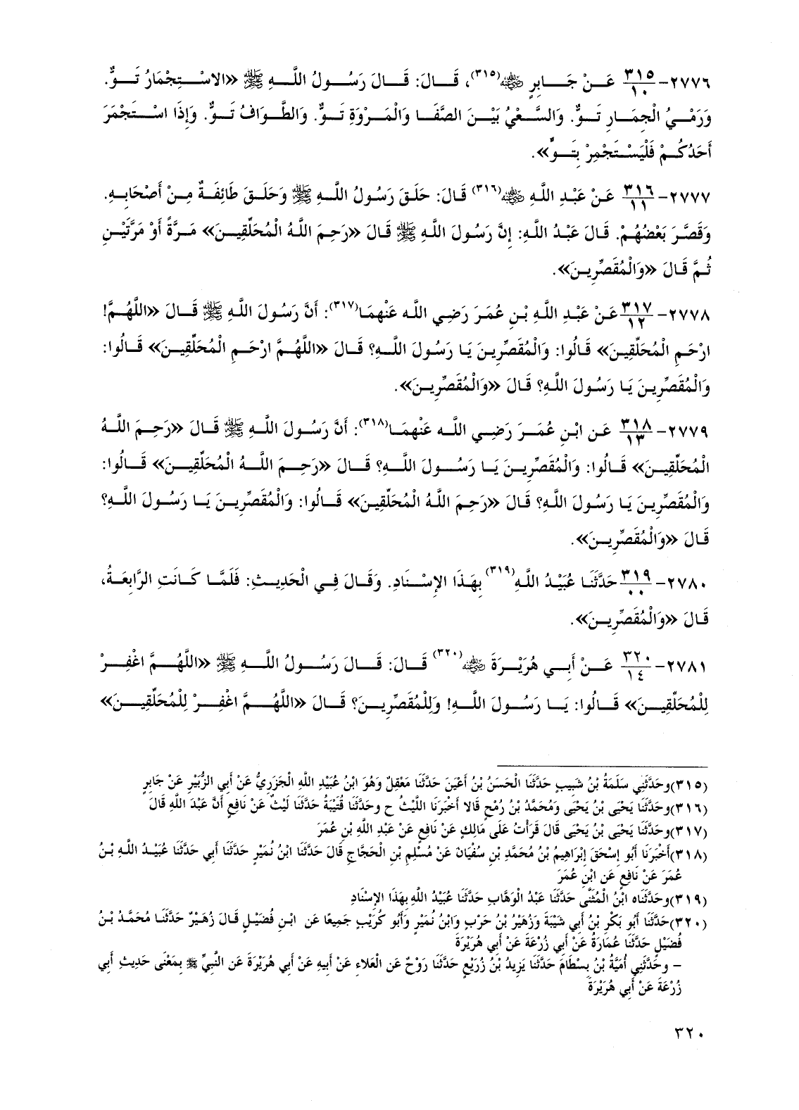 2777 - عن عبد الله رضي الله عنه قال: حلق رسول الله صلى الله عليه وسلم وحلق طائفة من أصحابه. وقصر بعضهم. قال عبد الله: إن رسول الله صلى الله عليه وسلم قال "رحم الله المحلقين" مرة أو مرتين ثم قال "والمقصرين".