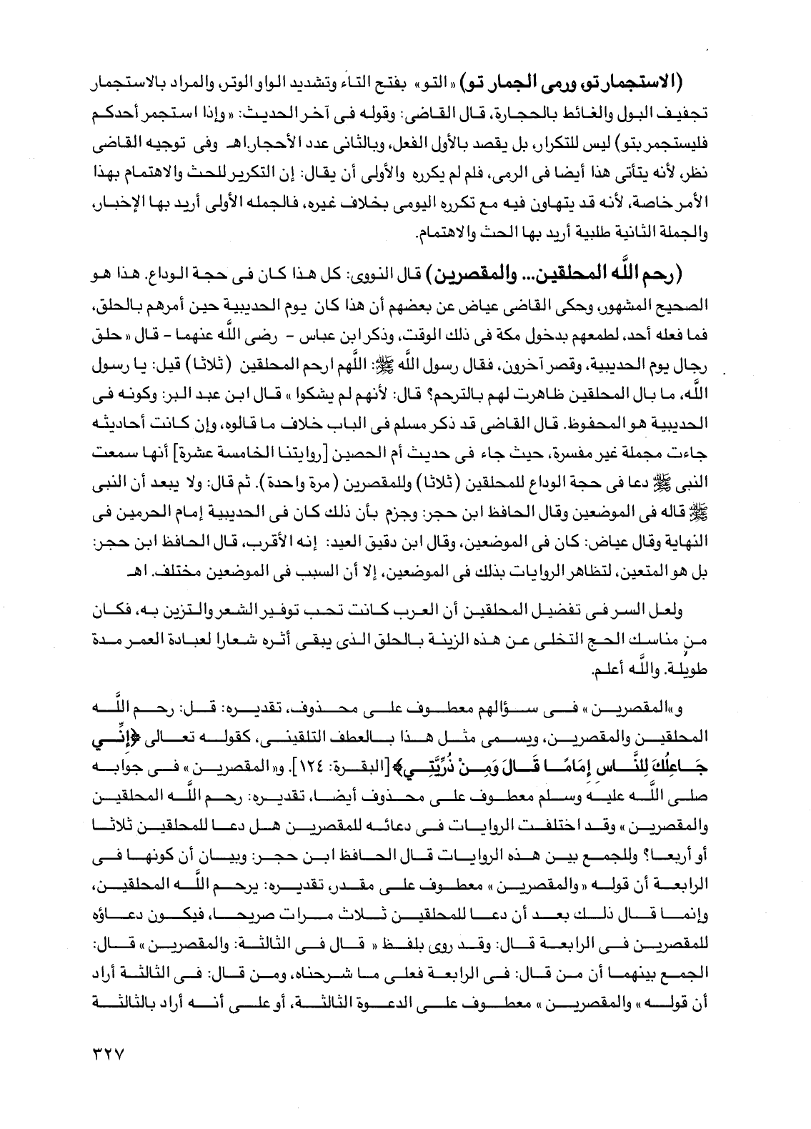 و"المقصرين" في سؤالهم معطوف على محذوف، تقديره: قل: رحم الله المحلقين والمقصرين، ويسمى مثل هذا بالعطف التلقيني، كقوله تعالى {إني جاعلك للناس إماماً قال ومن ذريتي} [البقرة: 124]. و"المقصرين" في جوابه صلى الله عليه وسلم معطوف على محذوف أيضاً، تقديره: رحم الله المحلقين والمقصرين" وقد اختلفت الروايات في دعائه للمقصرين هل دعا للمحلقين ثلاثاً أو أربعاً؟ وللجمع بين هذه الروايات قال الحافظ ابن حجر: وبيان أن كونها في الرابعة أن قوله "والمقصرين" معطوف على مقدر، تقديره: يرحم الله المحلقين، وإنما قال ذلك بعد أن دعا للمحلقين ثلاث مرات صريحاً، فيكون دعاؤه للمقصرين في الرابعة قال: وقد روي بلفظ "قال في الثالثة: والمقصرين" قال: الجمع بينهما أن من قال: في الرابعة فعلى ما شرحناه، ومن قال: في الثالثة أراد أن قوله "والمقصرين" معطوف على الدعوة الثالثة، أو على أنه أراد بالثالثة