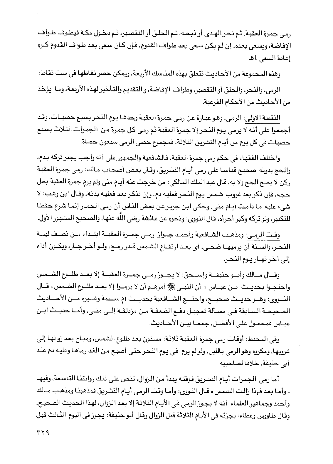 الرمي، والنحر، والحلق أو التقصير، وطواف الإفاضة، والتقديم والتأخير لهذه الأربعة، وما يؤخذ من الأحاديث من الأحكام الفرعية.