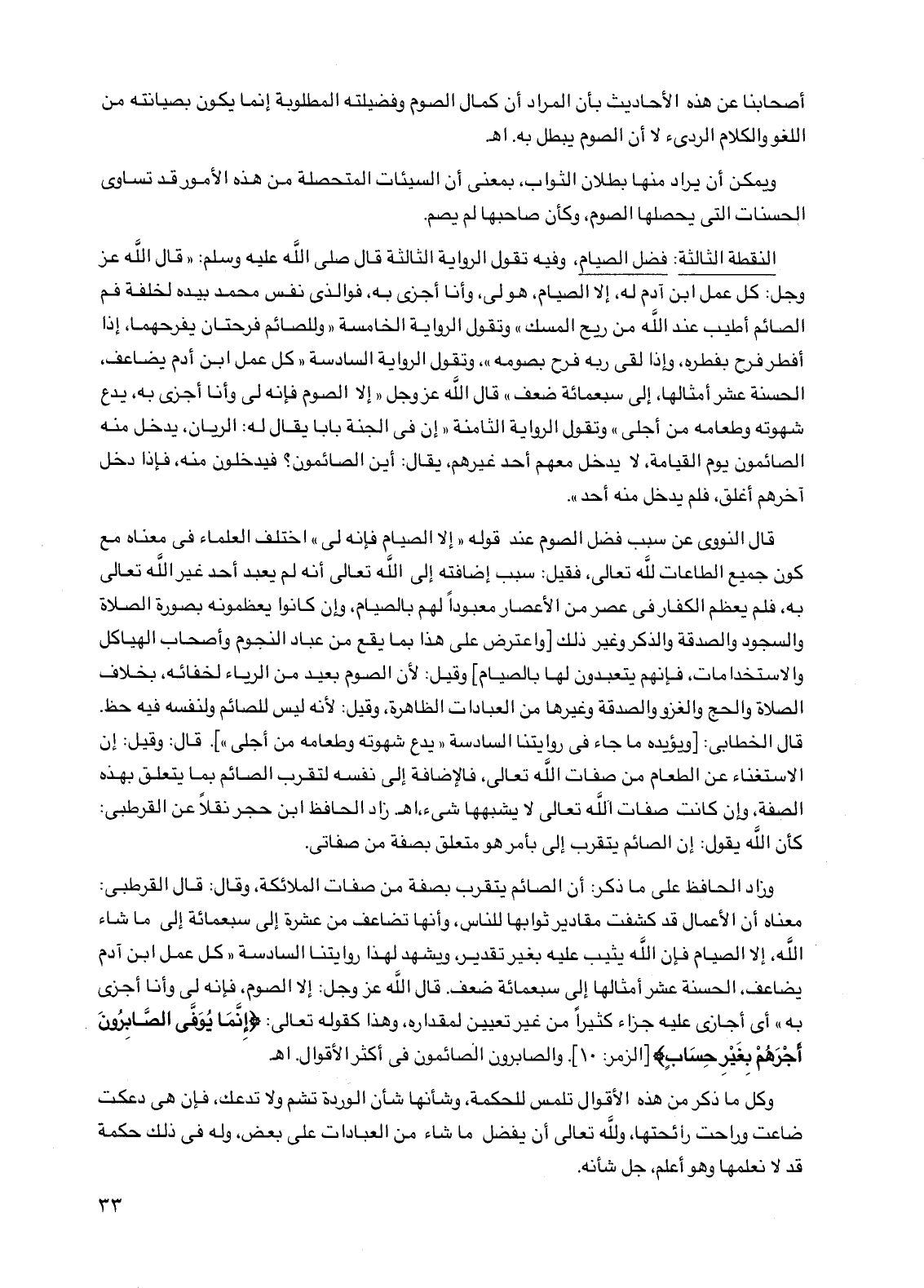 وزاد الحافظ على ما ذكر: أن الصائم يتقرب بصفة من صفات الملائكة، وقال: قال القرطبي: معناه أن الأعمال قد كشفت مقادير ثوابها للناس، وأنها تضاعف من عشرة إلى سبعمائة إلى ما شاء الله، إلا الصيام فإن الله يثيب عليه بغير تقدير، ويشهد لهذا روايتنا السادسة "كل عمل ابن آدم يضاعف، الحسنة عشر أمثالها إلى سبعمائة ضعف. قال الله عز وجل: إلا الصوم، فإنه لي وأنا أجزي به" أي أجازي عليه جزاء كثيراً من غير تعيين لمقداره، وهذا كقوله تعالى: {إنما يوفى الصابرون أجرهم بغير حساب} [الزمر: 10]. والصابرون الصائمون في أكثر الأقوال. اهـ