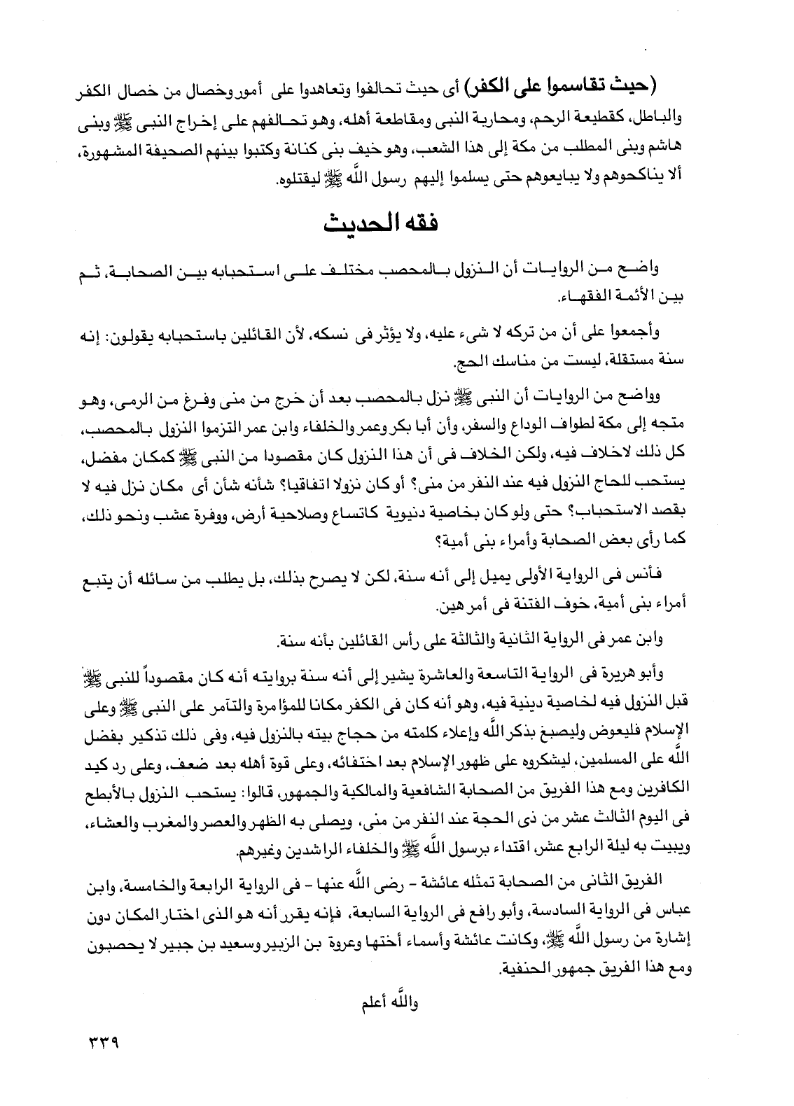 وأبو هريرة في الرواية التاسعة والعاشرة يشير إلى أنه سنة بروايته أنه كان مقصوداً للنبي صلى الله عليه وسلم قبل النزول فيه لخاصية دينية فيه، وهو أنه كان في الكفر مكاناً للمؤامرة والتآمر على النبي صلى الله عليه وسلم وعلى الإسلام فليعوض وليصبغ بذكر الله وإعلاء كلمته من حجاج بيته بالنزول فيه، وفي ذلك تذكير بفضل الله على المسلمين، ليشكروه على ظهور الإسلام بعد اختفائه، وعلى قوة أهله بعد ضعف، وعلى رد كيد الكافرين ومع هذا الفريق من الصحابة الشافعية والمالكية والجمهور، قالوا: يستحب النزول بالأبطح في اليوم الثالث عشر من ذي الحجة عند النفر من منى، ويصلى به الظهر والعصر والمغرب والعشاء، ويبيت به ليلة الرابع عشر، اقتداء برسول الله صلى الله عليه وسلم والخلفاء الراشدين وغيرهم.