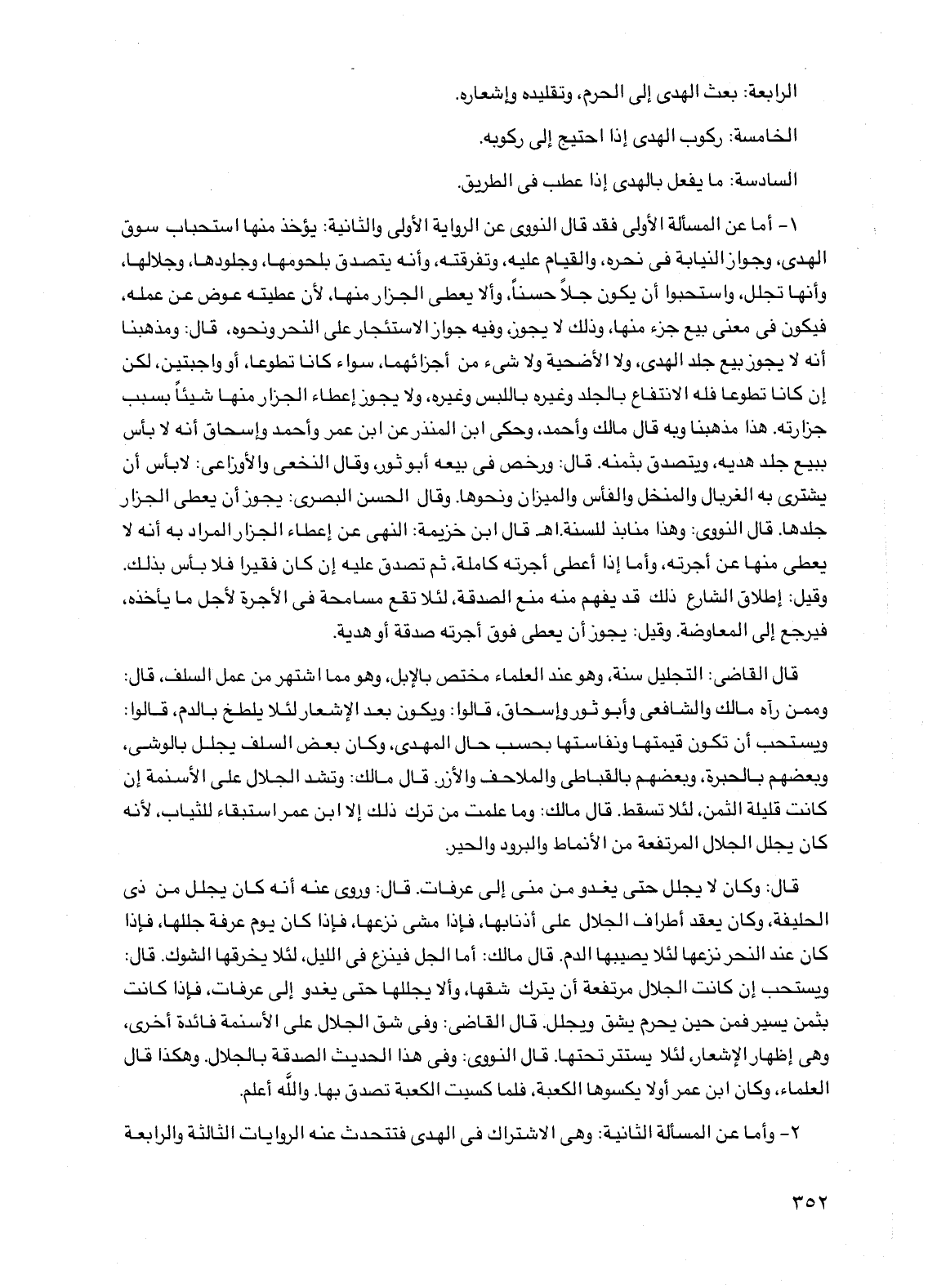 قال: وكان لا يجلل حتى يغدو من منى إلى عرفات. قال: وروي عنه أنه كان يجلل من ذي الحليفة، وكان يعقد أطراف الجلال على أذنابها، فإذا مشي نزعها، فإذا كان يوم عرفة جللها، فإذا كان عند النحر نزعها لئلا يصيبها الدم. قال مالك: أما الجل فينزع في الليل، لئلا يخرقها الشوك. قال: ويستحب إن كانت الجلال مرتفعة أن يترك شقها، وألا يجللها حتى يغدو إلى عرفات، فإذا كانت بثمن يسير فمن حين يحرم يشق ويجلل. قال القاضي: وفي شق الجلال على الأسنمة فائدة أخرى وهي إظهار الإشعار لئلا يستتر تحتها قال النووي وفي هذا الحديث الصدقة بالجلال. وهكذا قال العلماء، وكان ابن عمر أولاً يكسوها الكعبة، فلما كسيت الكعبة تصدق بها. والله أعلم.