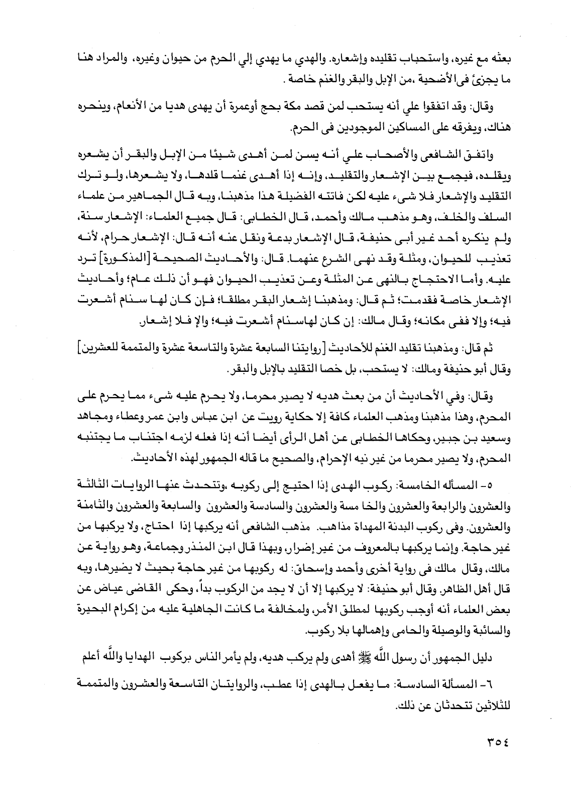 5 - المسألة الخامسة: ركوب الهدي إذا احتيج إلى ركوبه، وتتحدث عنها الروايات الثالثة والعشرون والرابعة والعشرون والخامسة والعشرون والسادسة والعشرون والسابعة والعشرون والثامنة والعشرون. وفي ركوب البدنة المهداة مذاهب. مذهب الشافعي أنه يركبها إذا احتاج، ولا يركبها من غير حاجة. وإنما يركبها بالمعروف من غير إضرار، وبهذا قال ابن المنذر وجماعة، وهو رواية عن مالك، وقال مالك في رواية أخرى وأحمد وإسحاق: له ركوبها من غير حاجة بحيث لا يضيرها، وبه قال أهل الظاهر. وقال أبو حنيفة: لا يركبها إلا أن لا يجد من الركوب بداً، وحكى القاضي عياض عن بعض العلماء أنه أوجب ركوبها لمطلق الأمر، ولمخالفة ما كانت الجاهلية عليه من إكرام البحيرة والسائبة والوصيلة والحامي وإهمالها بلا ركوب.
