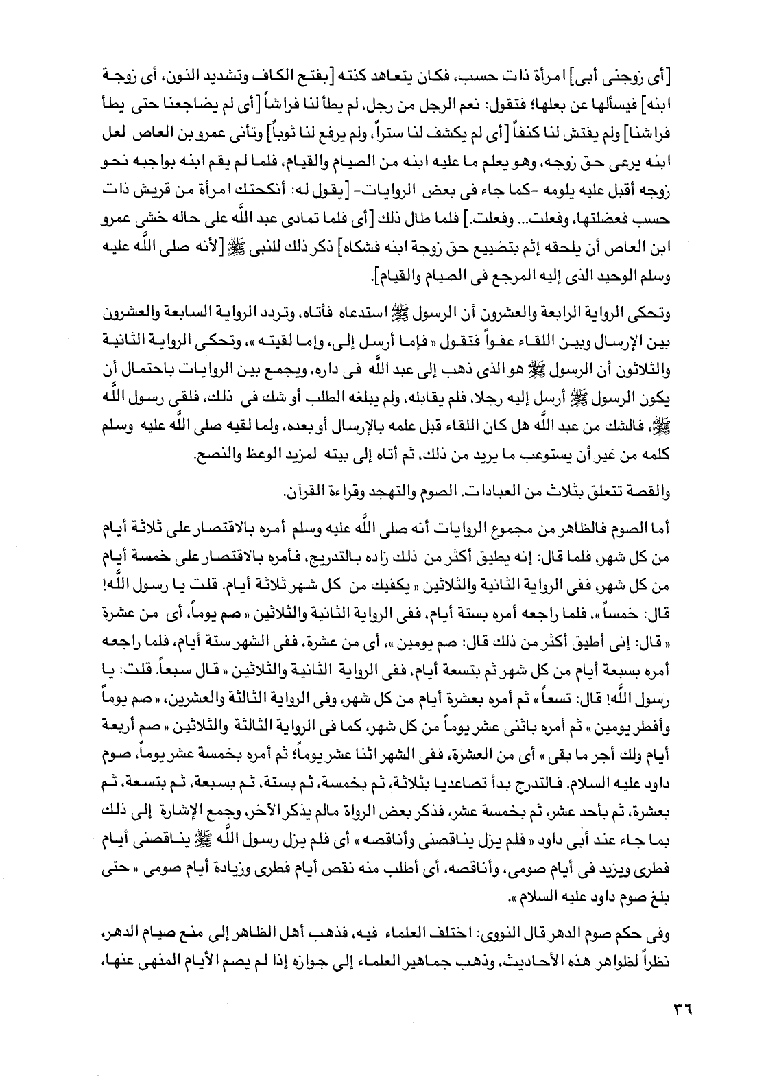 [أي زوجني أبي] امرأة ذات حسب، فكان يتعاهد كنته [بفتح الكاف وتشديد النون، أي زوجة ابنه] فيسألها عن بعلها؛ فتقول: نعم الرجل من رجل، لم يطأ لنا فراشاً [أي لم يضاجعنا حتى يطأ فراشنا] ولم يفتش لنا كنفاً [أي لم يكشف لنا ستراً، ولم يرفع لنا ثوباً] وتأنى عمرو بن العاص لعل ابنه يرعى حق زوجه، وهو يعلم ما عليه ابنه من الصيام والقيام، فلما لم يقم ابنه بواجبه نحو زوجه أقبل عليه يلومه -كما جاء في بعض الروايات