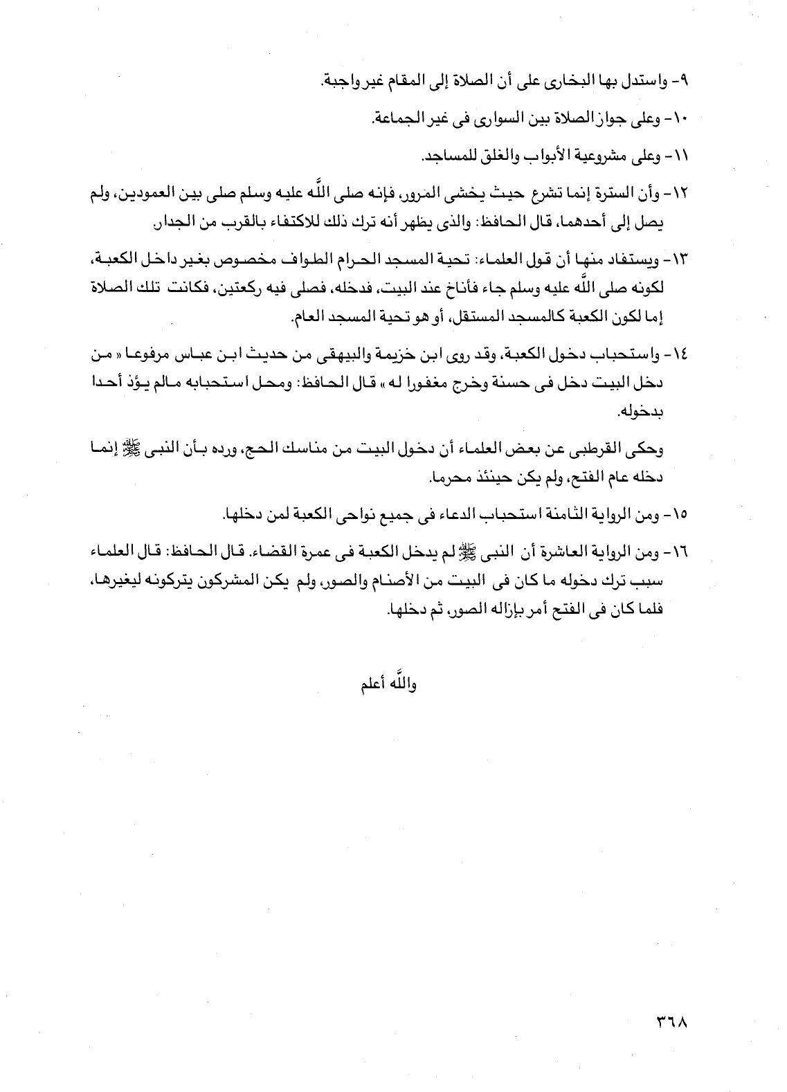 14 - واستحباب دخول الكعبة، وقد روى ابن خزيمة والبيهقي من حديث ابن عباس مرفوعاً "من دخل البيت دخل في حسنة وخرج مغفوراً له" قال الحافظ: ومحل استحبابه ما لم يؤذ أحداً بدخوله.