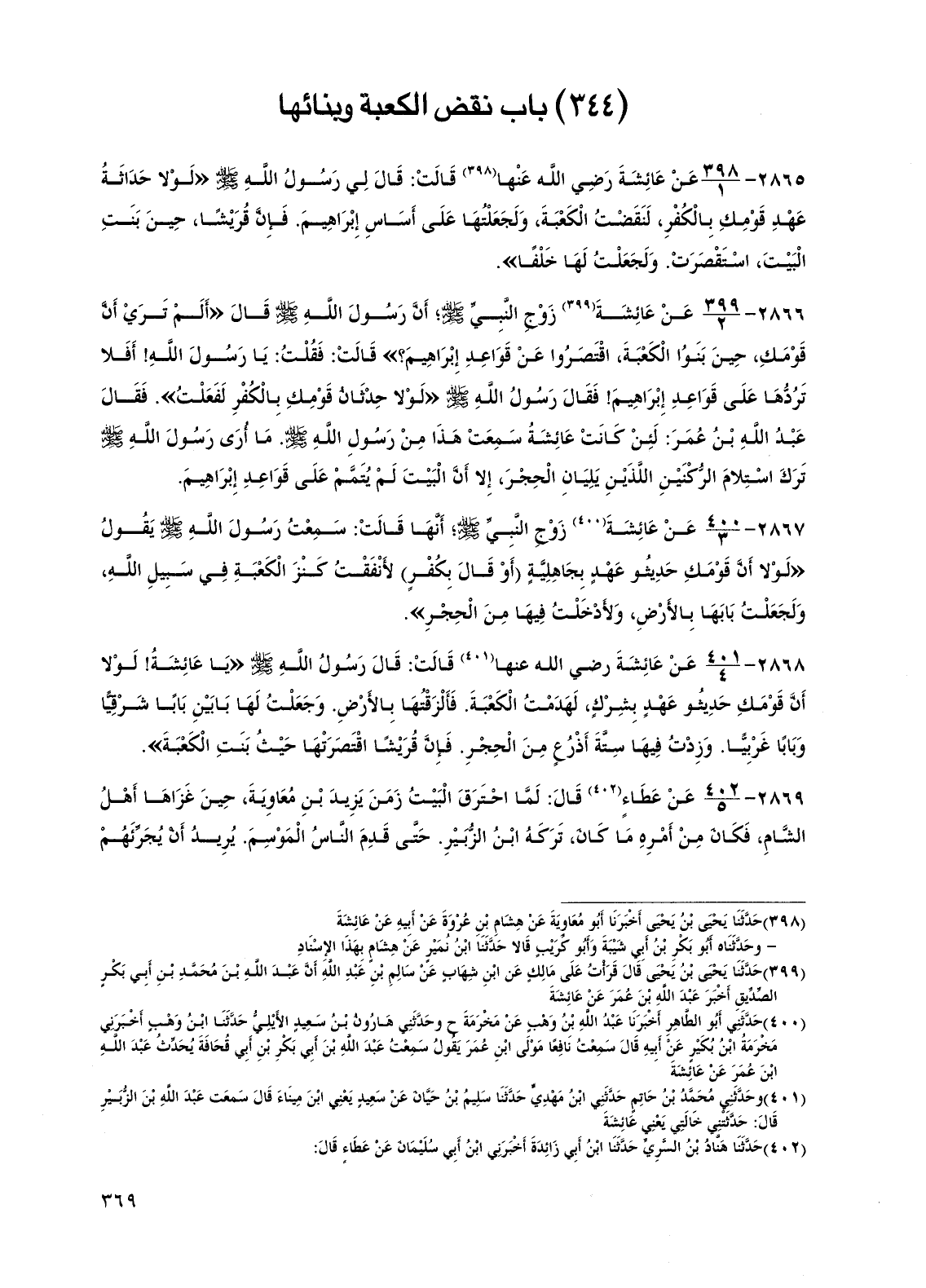 2865 - عن عائشة رضي الله عنها قالت: قال لي رسول الله صلى الله عليه وسلم "لولا حداثة عهد قومك بالكفر، لنقضت الكعبة، ولجعلتها على أساس إبراهيم. فإن قريشاً، حين بنت البيت، استقصرت. ولجعلت لها خلفاً".