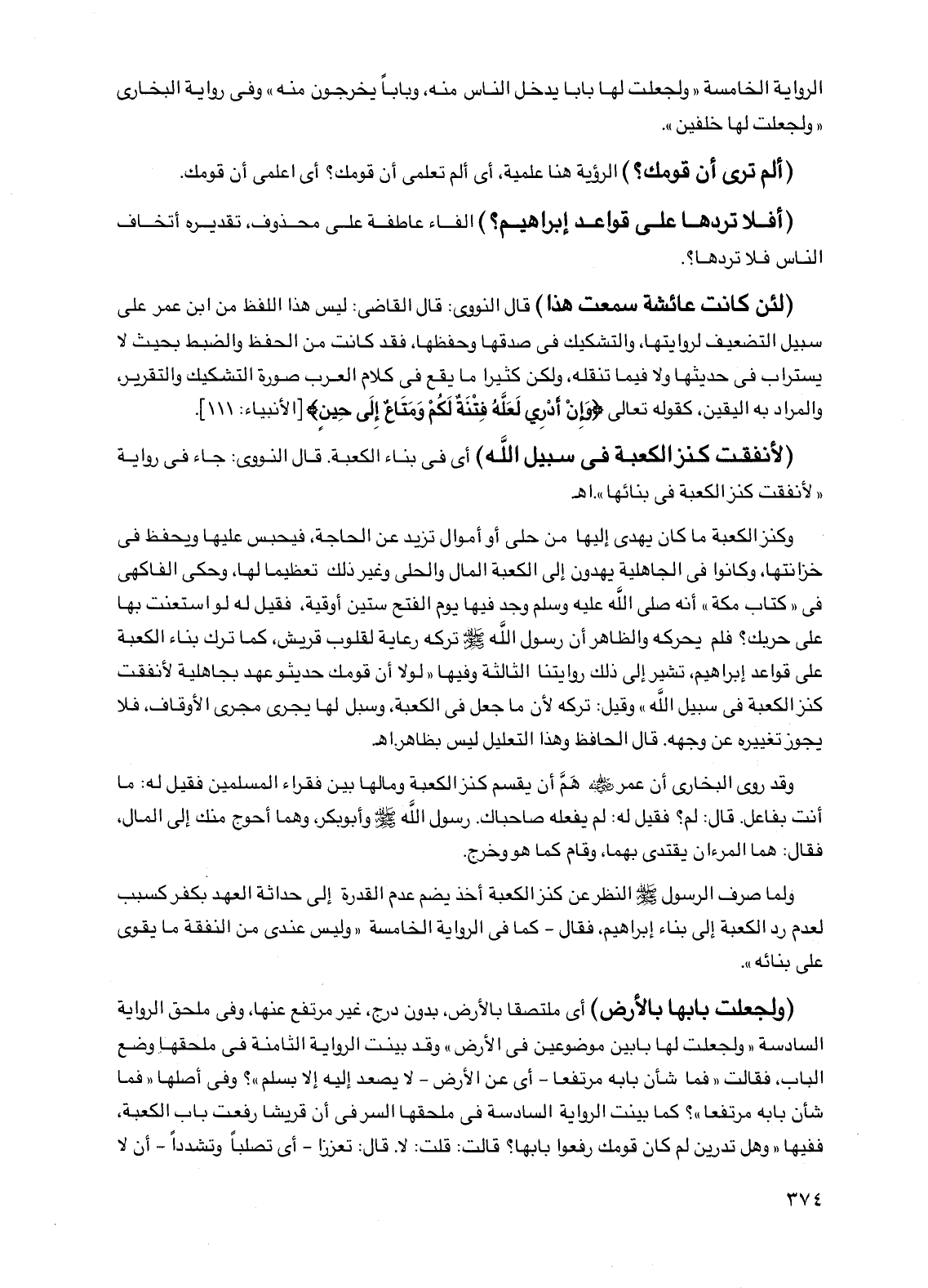 ولما صرف الرسول صلى الله عليه وسلم النظر عن كنز الكعبة أخذ يضم عدم القدرة إلى حداثة العهد بكفر كسبب لعدم رد الكعبة إلى بناء إبراهيم، فقال -كما في الرواية الخامسة "وليس عندي من النفقة ما يقوى على بنائه".