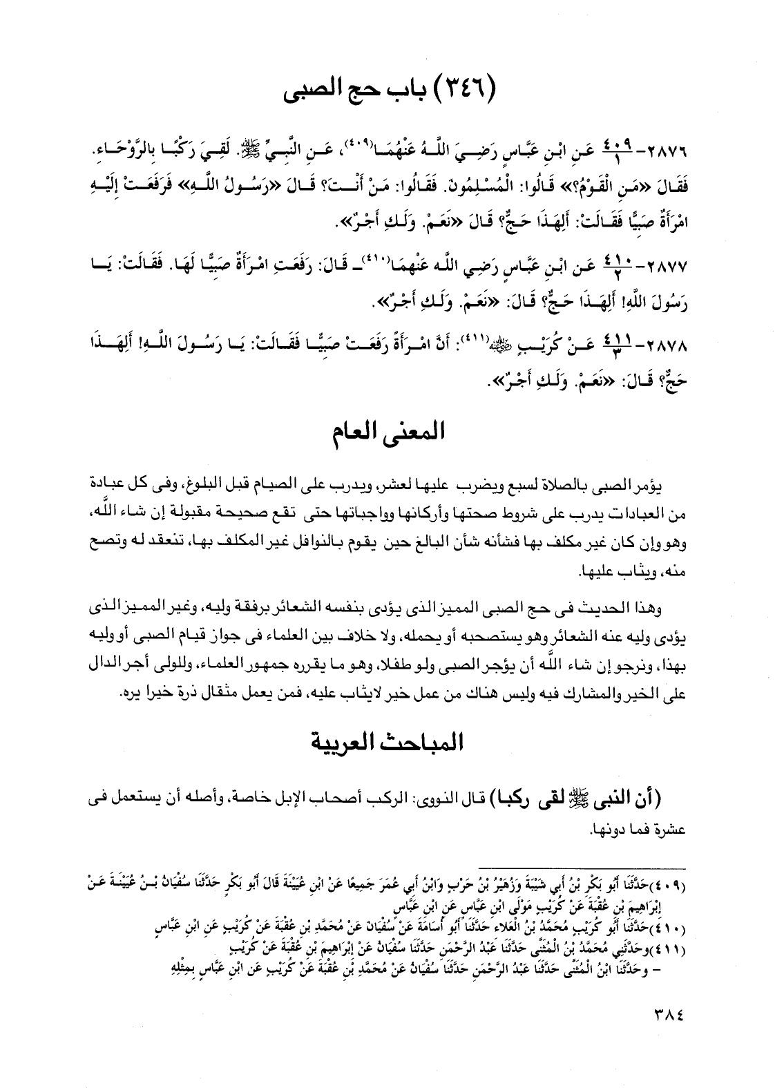 2876 - عن ابن عباس رضي الله عنهما، عن النبي صلى الله عليه وسلم. لقي ركباً بالروحاء. فقال "من القوم؟ " قالوا: المسلمون. فقالوا: من أنت؟ قال "رسول الله" فرفعت إليه امرأة صبياً فقالت: ألهذا حج؟ قال "نعم. ولك أجر".