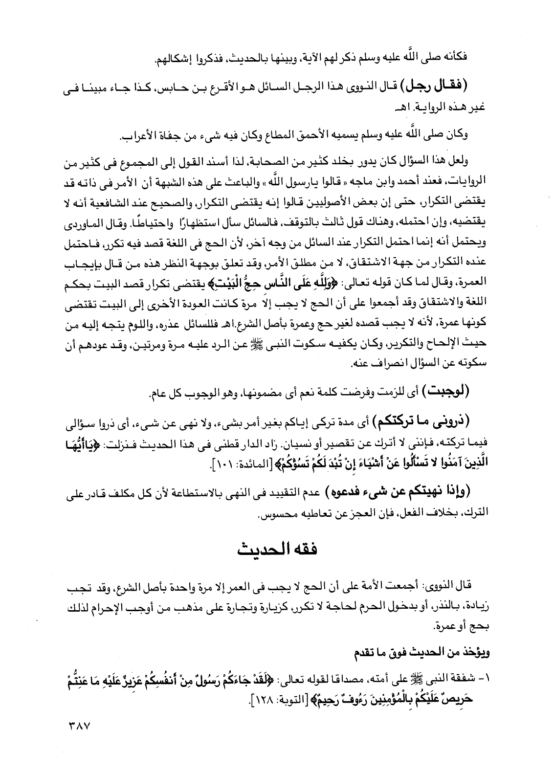 ولعل هذا السؤال كان يدور بخلد كثير من الصحابة، لذا أسند القول إلى المجموع في كثير من الروايات، فعند أحمد وابن ماجه "قالوا يا رسول الله" والباعث على هذه الشبهة أن الأمر في ذاته قد يقتضي التكرار، حتى إن بعض الأصوليين قالوا إنه يقتضي التكرار، والصحيح عند الشافعية أنه لا يقتضيه، وإن احتمله، وهناك قول ثالث بالتوقف، فالسائل سأل استظهاراً واحتياطاً. وقال الماوردي ويحتمل أنه إنما احتمل التكرار عند السائل من وجه آخر، لأن الحج في اللغة قصد فيه تكرر، فاحتمل عنده التكرار من جهة الاشتقاق، لا من مطلق الأمر، وقد تعلق بوجهة النظر هذه من قال بإيجاب العمرة، وقال لما كان قوله تعالى: {ولله على الناس حج البيت} يقتضي تكرار قصد البيت بحكم اللغة والاشتقاق وقد أجمعوا على أن الحج لا يجب إلا مرة كانت العودة الأخرى إلى البيت تقتضي كونها عمرة، لأنه لا يجب قصده لغير حج وعمرة بأصل الشرع. اهـ فللسائل عذره، واللوم يتجه إليه من حيث الإلحاح والتكرير، وكان يكفيه سكوت النبي صلى الله عليه وسلم عن الرد عليه مرة ومرتين، وقد عودهم أن سكوته عن السؤال انصراف عنه.