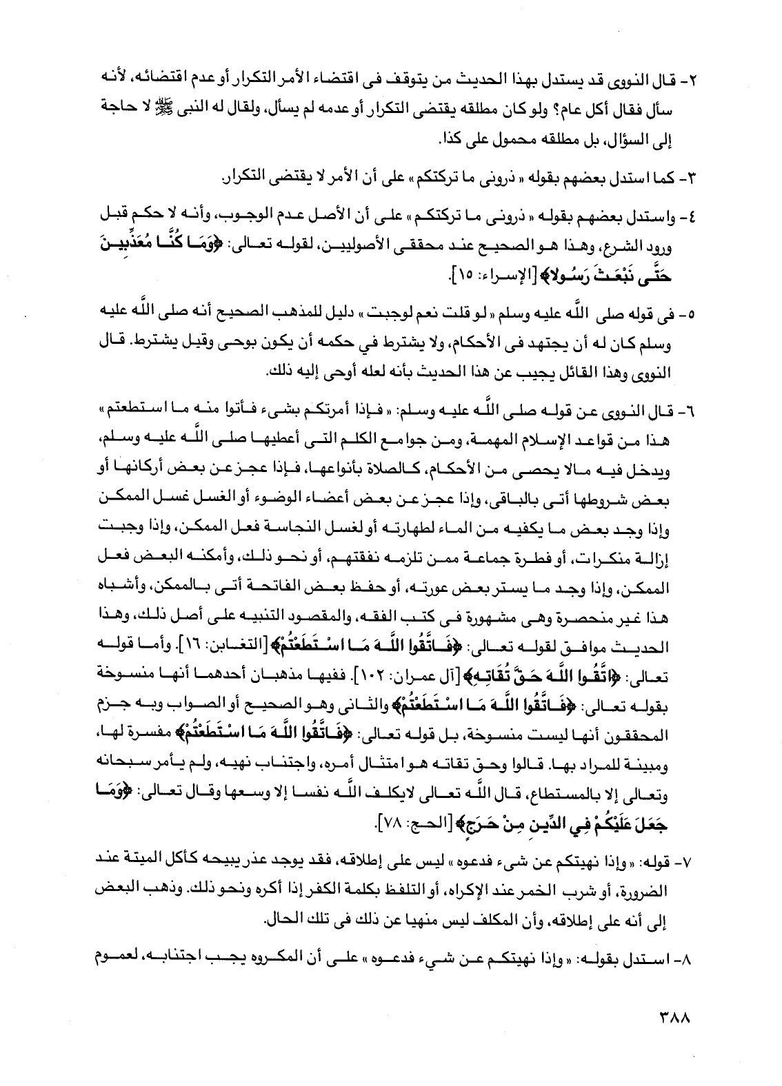 7 - قوله: "وإذا نهيتكم عن شيء فدعوه" ليس على إطلاقه، فقد يوجد عذر يبيحه كأكل الميتة عند الضرورة، أو شرب الخمر عند الإكراه، أو التلفظ بكلمة الكفر إذا أكره ونحو ذلك. وذهب البعض إلى أنه على إطلاقه، وأن المكلف ليس منهياً عن ذلك في تلك الحال.
