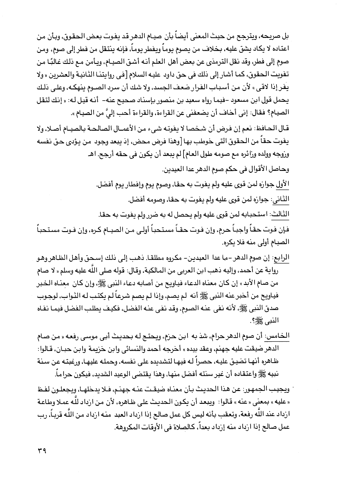 الخامس: أن صوم الدهر حرام، شذ به ابن حزم، ويحتج له بحديث أبي موسى رفعه "من صام الدهر ضيقت عليه جهنم، وعقد بيده" أخرجه أحمد والنسائي وابن خزيمة وابن حبان، قالوا: ظاهره أنها تضيق عليه، حصراً له فيها لتشديده على نفسه، وحمله عليها، ورغبته عن سنة نبيه صلى الله عليه وسلم واعتقاده أن غير سنته أفضل منها، وهذا يقتضي الوعيد الشديد، فيكون حراماً.
