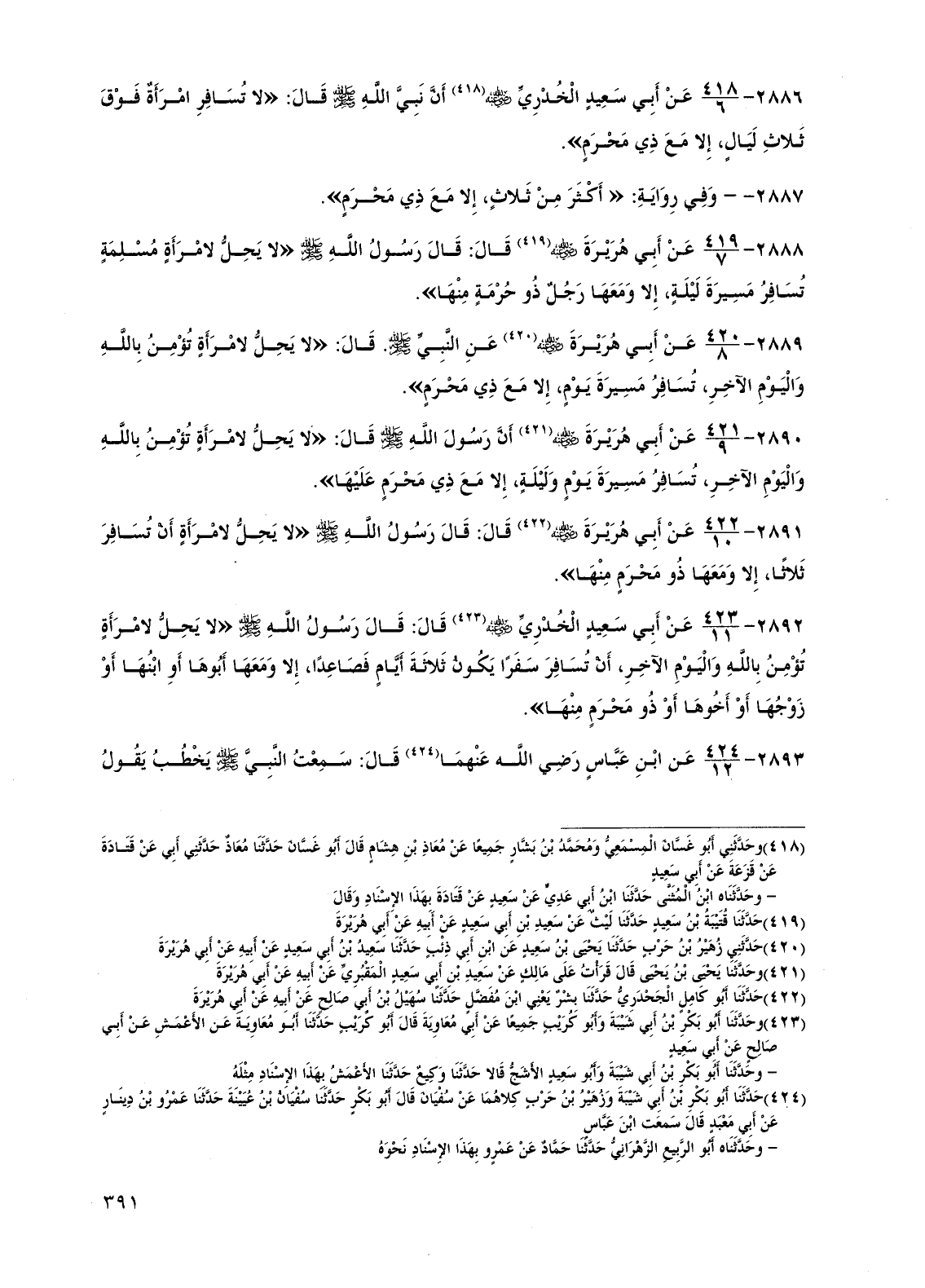 2891 - عن أبي هريرة رضي الله عنه قال: قال رسول الله صلى الله عليه وسلم "لا يحل لامرأة أن تسافر ثلاثاً، إلا ومعها ذو محرم منها".
