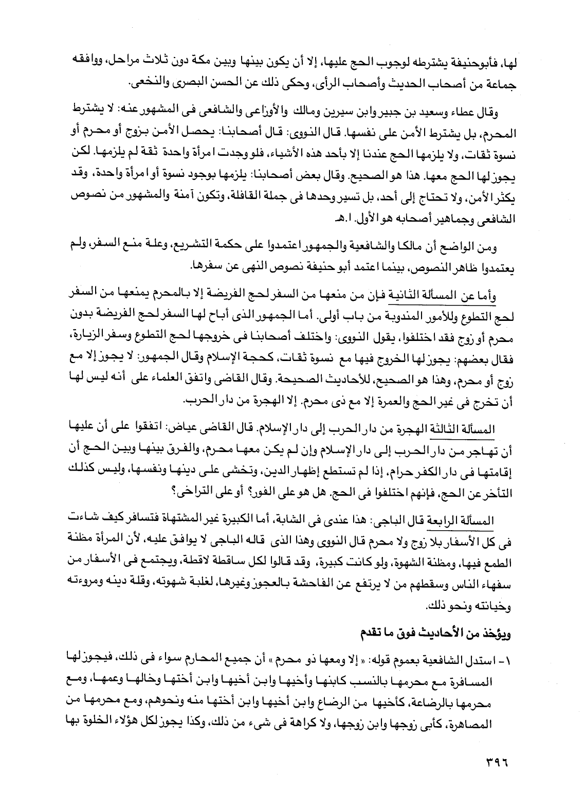 1 - استدل الشافعية بعموم قوله: "إلا ومعها ذو محرم" أن جميع المحارم سواء في ذلك، فيجوز لها المسافرة مع محرمها بالنسب كابنها وأخيها وابن أخيها وابن أختها وخالها وعمها، ومع محرمها بالرضاعة، كأخيها من الرضاع وابن أخيها وابن أختها منه ونحوهم، ومع محرمها من المصاهرة، كأبي زوجها وابن زوجها، ولا كراهة في شيء من ذلك، وكذا يجوز لكل هؤلاء الخلوة بها