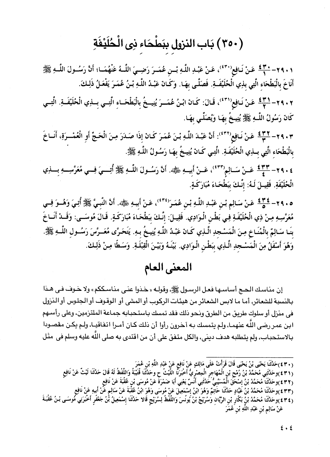 2905 - عن سالم بن عبد الله بن عمر، عن أبيه رضي الله عنه. أن النبي صلى الله عليه وسلم أتي وهو في معرسه من ذي الحليفة في بطن الوادي. فقيل: إنك ببطحاء مباركة. قال موسى: وقد أناخ بنا سالم بالمناخ من المسجد الذي كان عبد الله ينيخ به. يتحرى معرس رسول الله صلى الله عليه وسلم. وهو أسفل من المسجد الذي ببطن الوادي. بينه وبين القبلة. وسطاً من ذلك.
