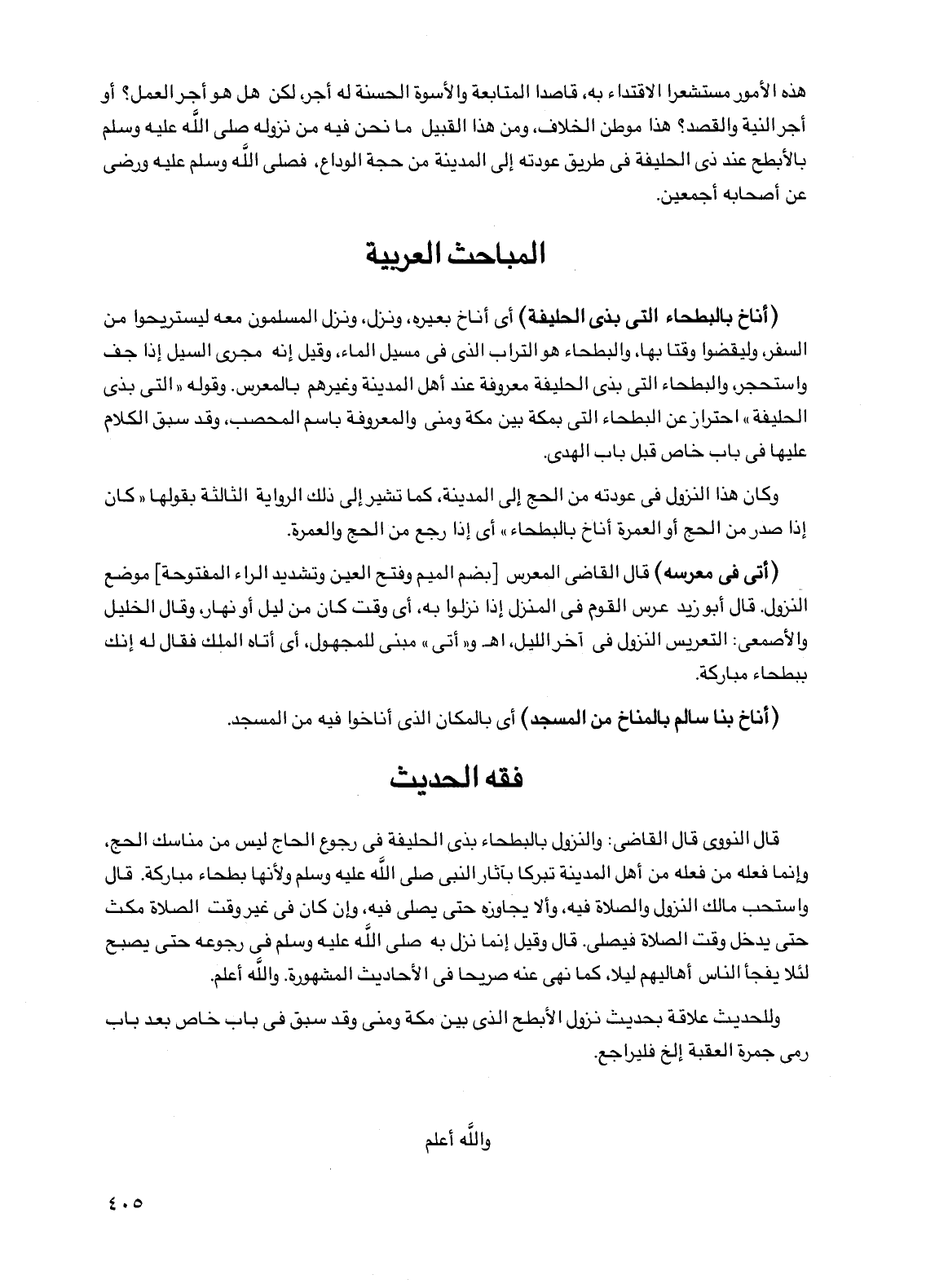 هذه الأمور مستشعراً الاقتداء به، قاصداً المتابعة والأسوة الحسنة له أجر، لكن هل هو أجر العمل؟ أو أجر النية والقصد؟ هذا موطن الخلاف، ومن هذا القبيل ما نحن فيه من نزوله صلى الله عليه وسلم بالأبطح عند ذي الحليفة في طريق عودته إلى المدينة من حجة الوداع، فصلى الله وسلم عليه ورضي عن أصحابه أجمعين.