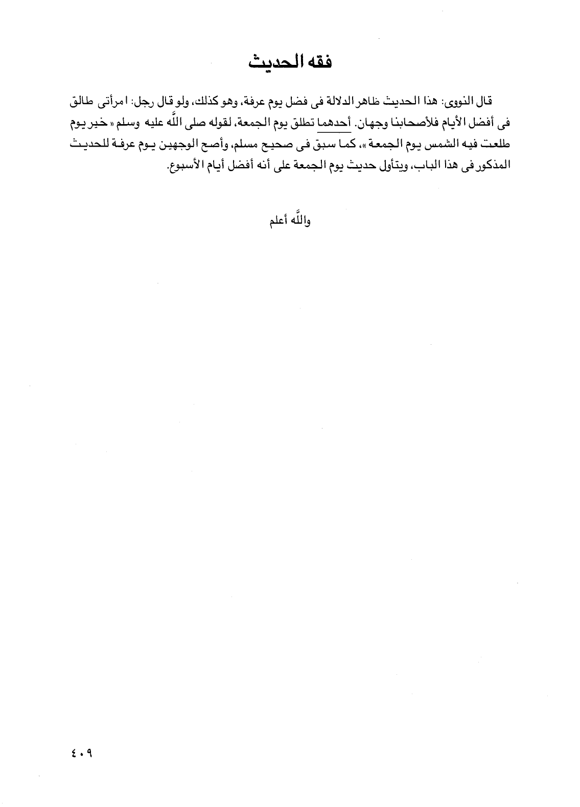 قال النووي: هذا الحديث ظاهر الدلالة في فضل يوم عرفة، وهو كذلك، ولو قال رجل: امرأتي طالق في أفضل الأيام فلأصحابنا وجهان. أحدهما تطلق يوم الجمعة، لقوله صلى الله عليه وسلم "خير يوم طلعت فيه الشمس يوم الجمعة"، كما سبق في صحيح مسلم، وأصح الوجهين يوم عرفة للحديث المذكور في هذا الباب، ويتأول حديث يوم الجمعة على أنه أفضل أيام الأسبوع.