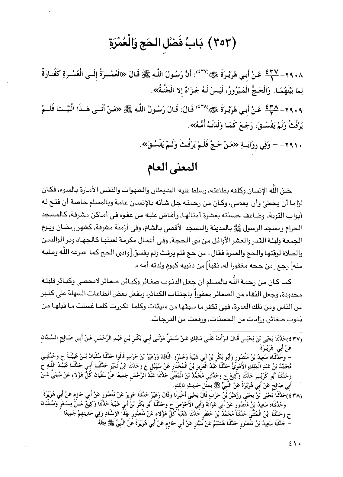 2908 - عن أبي هريرة رضي الله عنه: أن رسول الله صلى الله عليه وسلم قال "العمرة إلى العمرة كفارة لما بينهما. والحج المبرور، ليس له جزاء إلا الجنة".