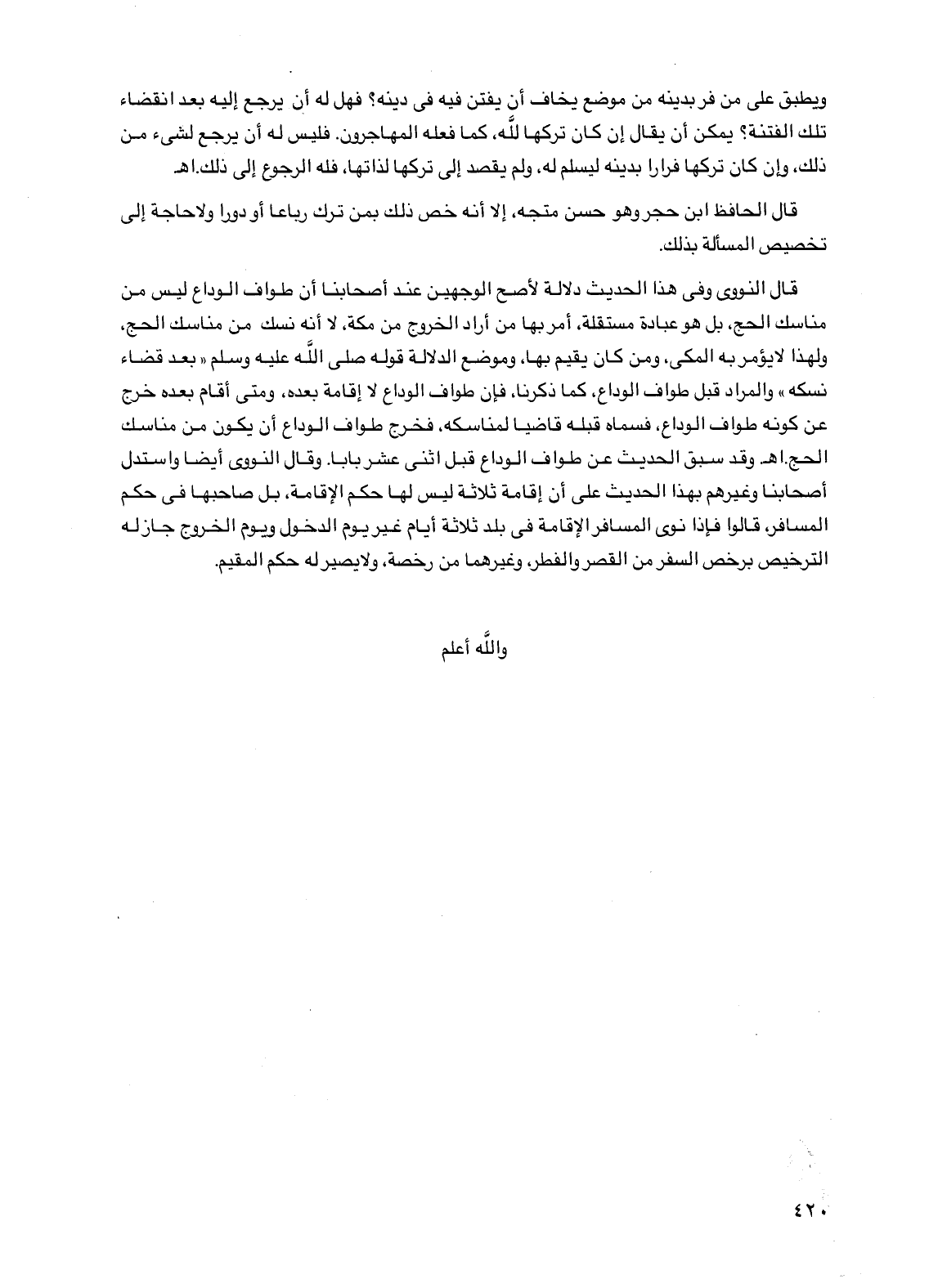 قال النووي وفي هذا الحديث دلالة لأصح الوجهين عند أصحابنا أن طواف الوداع ليس من مناسك الحج، بل هو عبادة مستقلة، أمر بها من أراد الخروج من مكة، لا أنه نسك من مناسك الحج، ولهذا لا يؤمر به المكي، ومن كان يقيم بها، وموضع الدلالة قوله صلى الله عليه وسلم "بعد قضاء نسكه" والمراد قبل طواف الوداع، كما ذكرنا، فإن طواف الوداع لا إقامة بعده، ومتى أقام بعده خرج عن كونه طواف الوداع، فسماه قبله قاضياً لمناسكه، فخرج طواف الوداع أن يكون من مناسك الحج. اهـ وقد سبق الحديث عن طواف الوداع قبل اثنى عشر باباً. وقال النووي أيضاً واستدل أصحابنا وغيرهم بهذا الحديث على أن إقامة ثلاثة ليس لها حكم الإقامة، بل صاحبها في حكم المسافر، قالوا فإذا نوى المسافر الإقامة في بلد ثلاثة أيام غير يوم الدخول ويوم الخروج جاز له الترخيص برخص السفر من القصر والفطر، وغيرهما من رخصة، ولا يصير له حكم المقيم.