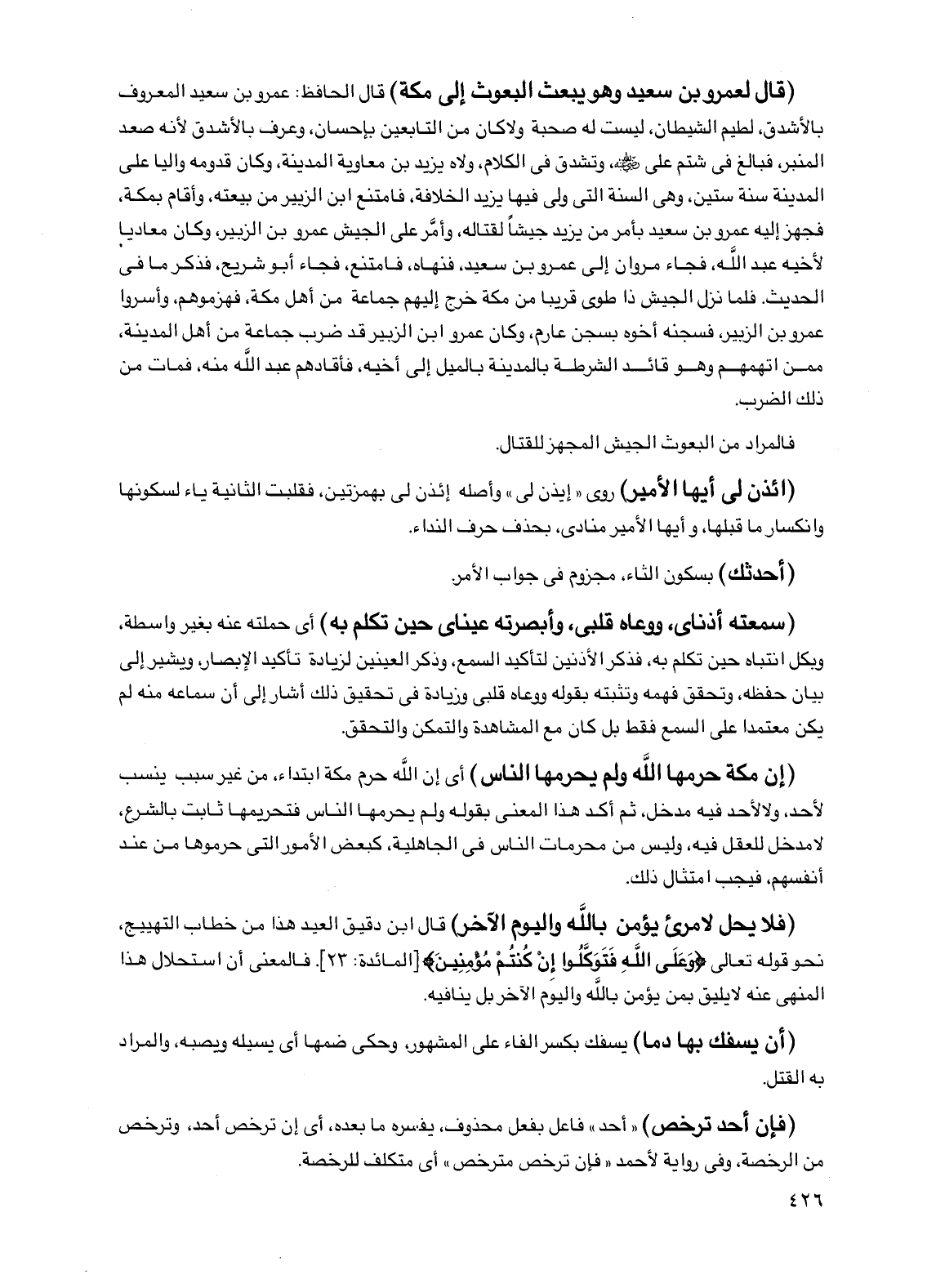 (قال لعمرو بن سعيد وهو يبعث البعوث إلى مكة) قال الحافظ: عمرو بن سعيد المعروف بالأشدق، لطيم الشيطان، ليست له صحبة ولا كان من التابعين بإحسان، وعرف بالأشدق لأنه صعد المنبر، فبالغ في شتم علي رضي الله عنه، وتشدق في الكلام، ولاه يزيد بن معاوية المدينة، وكان قدومه والياً على المدينة سنة ستين، وهي السنة التي ولي فيها يزيد الخلافة، فامتنع ابن الزبير من بيعته، وأقام بمكة، فجهز إليه عمرو بن سعيد بأمر من يزيد جيشاً لقتاله، وأمر على الجيش عمرو بن الزبير، وكان معادياً لأخيه عبد الله، فجاء مروان إلى عمرو بن سعيد، فنهاه، فامتنع، فجاء أبو شريح، فذكر ما في الحديث. فلما نزل الجيش ذا طوى قريباً من مكة خرج إليهم جماعة من أهل مكة، فهزموهم، وأسروا عمرو بن الزبير، فسجنه أخوه بسجن عارم، وكان عمرو بن الزبير قد ضرب جماعة من أهل المدينة، ممن اتهمهم وهو قائد الشرطة بالمدينة بالميل إلى أخيه، فأقادهم عبد الله منه، فمات من ذلك الضرب.