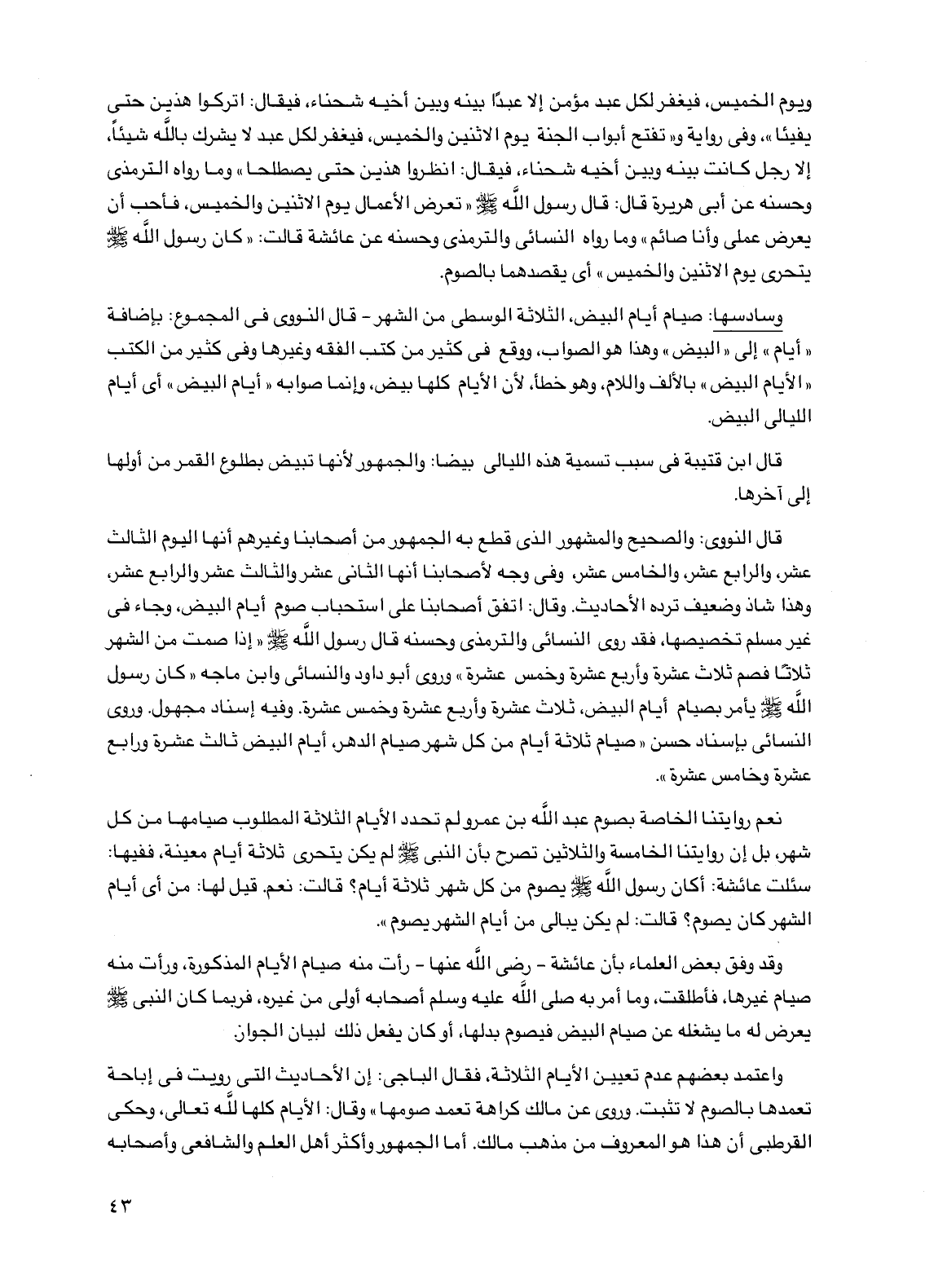 قال النووي: والصحيح والمشهور الذي قطع به الجمهور من أصحابنا وغيرهم أنها اليوم الثالث عشر، والرابع عشر، والخامس عشر، وفي وجه لأصحابنا أنها الثاني عشر والثالث عشر والرابع عشر، وهذا شاذ وضعيف ترده الأحاديث. وقال: اتفق أصحابنا على استحباب صوم أيام البيض، وجاء في غير مسلم تخصيصها، فقد روي النسائي والترمذي وحسنه قال رسول الله صلى الله عليه وسلم "إذا صمت من الشهر ثلاثاً فصم ثلاث عشرة وأربع عشرة وخمس عشرة" وروى أبو داود والنسائي وابن ماجه "كان رسول الله صلى الله عليه وسلم يأمر بصيام أيام البيض، ثلاث عشرة وأربع عشرة وخمس عشرة. وفيه إسناد مجهول. وروى النسائي بإسناد حسن "صيام ثلاثة أيام من كل شهر صيام الدهر، أيام البيض ثالث عشرة ورابع عشرة وخامس عشرة".