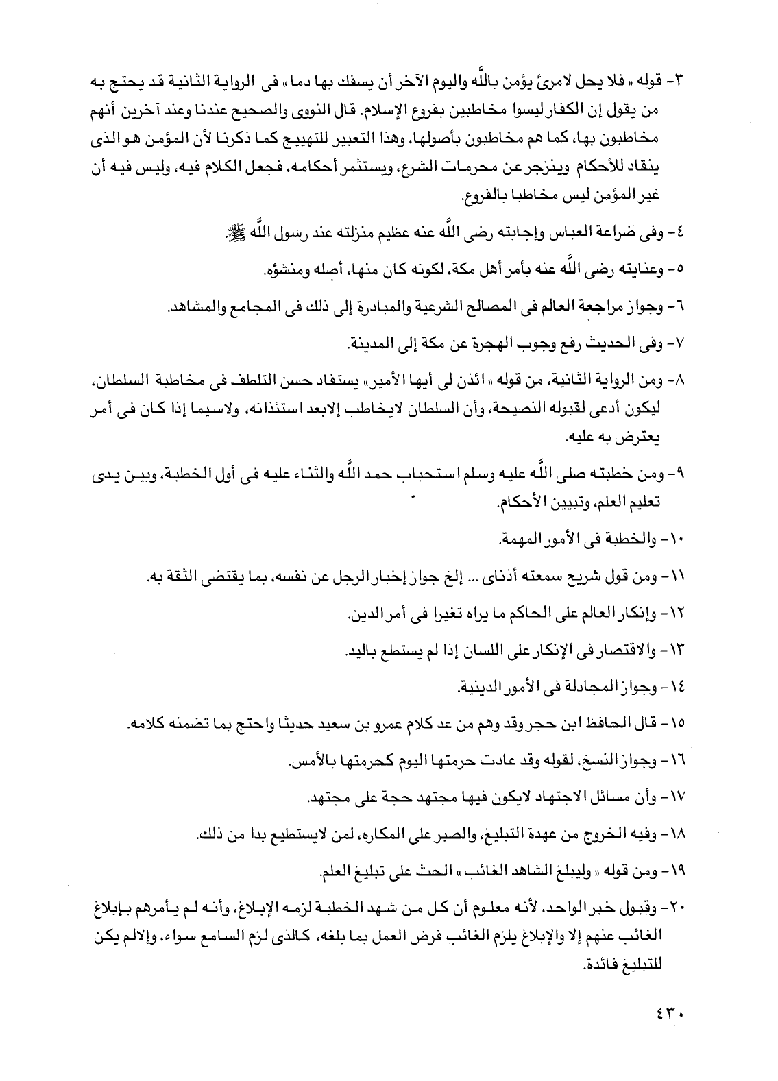 20 - وقبول خبر الواحد، لأنه معلوم أن كل من شهد الخطبة لزمه الإبلاغ، وأنه لم يأمرهم بإبلاغ الغائب عنهم إلا والإبلاغ يلزم الغائب فرض العمل بما بلغه، كالذي لزم السامع سواء، وإلا لم يكن للتبليغ فائدة.