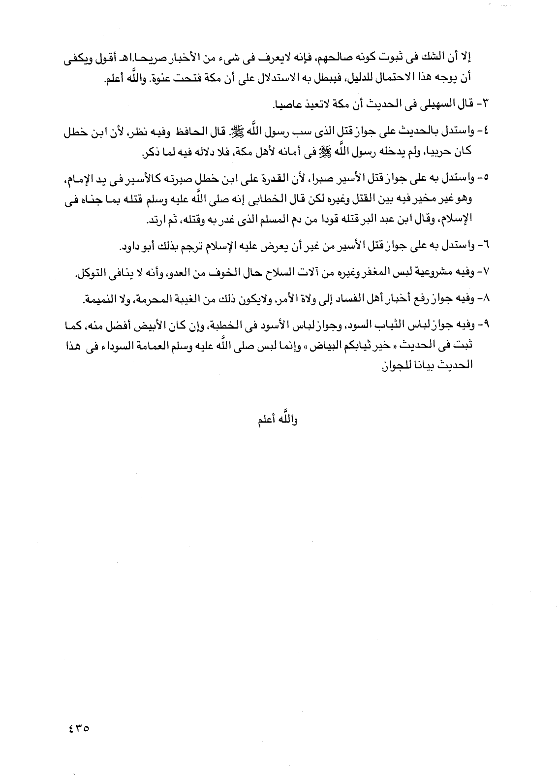 5 - واستدل به على جواز قتل الأسير صبراً، لأن القدرة على ابن خطل صيرته كالأسير في يد الإمام، وهو غير مخير فيه بين القتل وغيره لكن قال الخطابي إنه صلى الله عليه وسلم قتله بما جناه في الإسلام، وقال ابن عبد البر قتله قوداً من دم المسلم الذي غدر به وقتله. ثم ارتد.