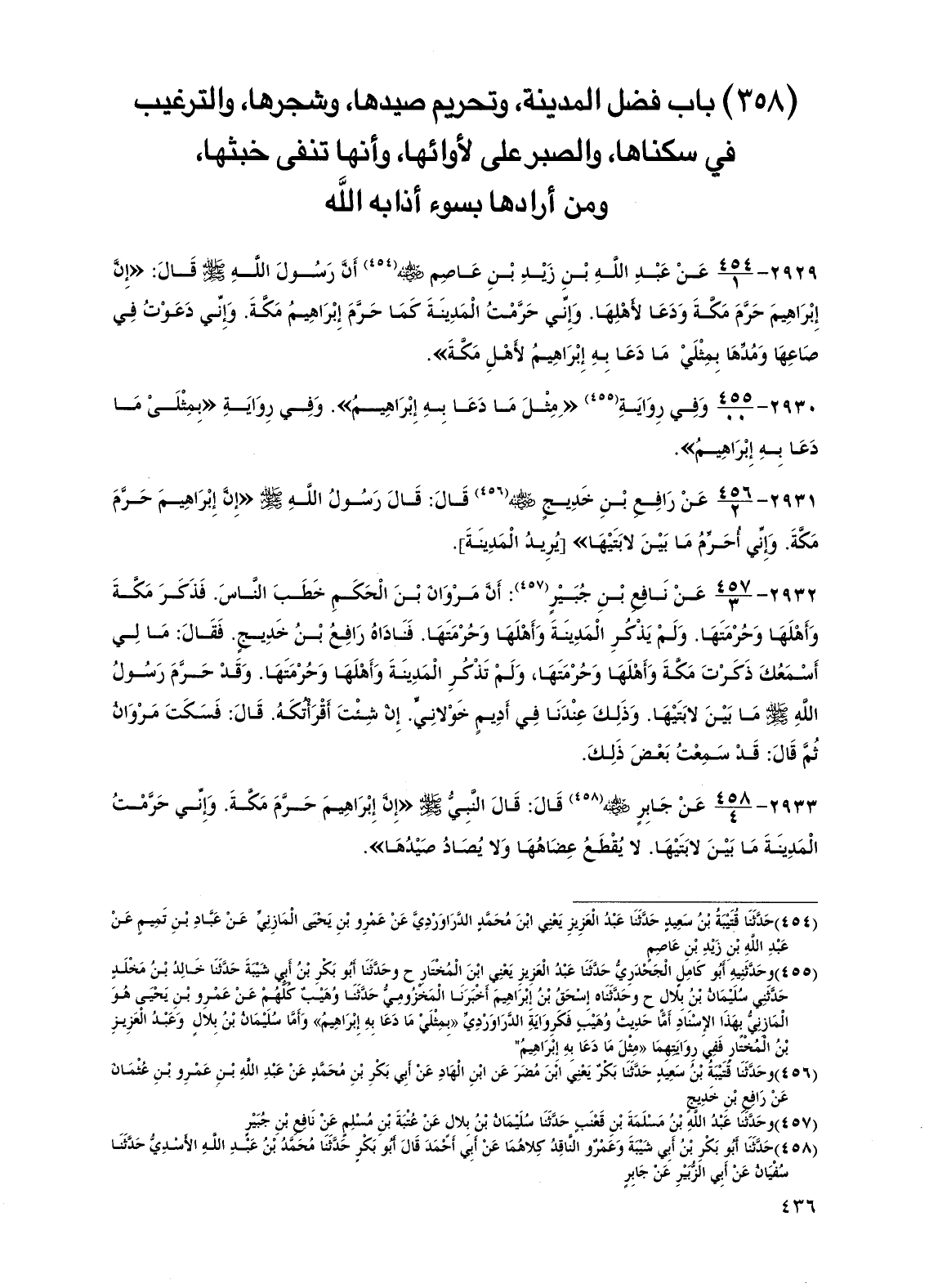 2933 - عن جابر رضي الله عنه قال: قال النبي صلى الله عليه وسلم "إن إبراهيم حرم مكة. وإني حرمت المدينة ما بين لابتيها. لا يقطع عضاهها ولا يصاد صيدها.