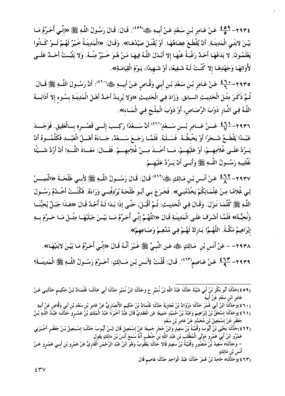 2934 - عن عامر بن سعد عن أبيه رضي الله عنه. قال: قال رسول الله صلى الله عليه وسلم "إني أحرم ما بين لابتي المدينة. أن يقطع عضاهها. أو يقتل صيدها". وقال: "المدينة خير لهم لو كانوا يعلمون. لا يدعها أحد رغبة عنها إلا أبدل الله فيها من هو خير منه. ولا يثبت أحد على لأوائها وجهدها إلا كنت له شفيعاً، أو شهيداً، يوم القيامة".