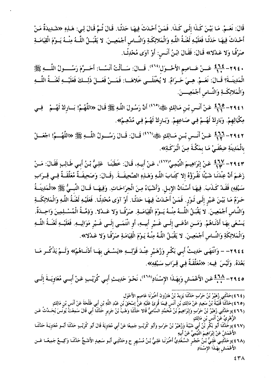 2943 - عن إبراهيم التيمي، عن أبيه، قال: خطبنا علي بن أبي طالب فقال: من زعم أن عندنا شيئاً نقرؤه إلا كتاب الله وهذه الصحيفة. (قال: وصحيفة معلقة في قراب سيفه) فقد كذب فيها أسنان الإبل. وأشياء من الجراحات. وفيها قال النبي صلى الله عليه وسلم "المدينة حرم ما بين عير إلى ثور. فمن أحدث فيها حدثاً. أو آوى محدثاً. فعليه لعنة الله والملائكة والناس أجمعين. لا يقبل الله منه يوم القيامة. صرفاً ولا عدلاً. وذمة المسلمين واحدة. يسعى بها أدناهم. ومن ادعى إلى غير أبيه، أو انتمى إلى غير مواليه. فعليه لعنة الله والملائكة والناس أجمعين. لا يقبل الله منه يوم القيامة صرفاً ولا عدلاً".