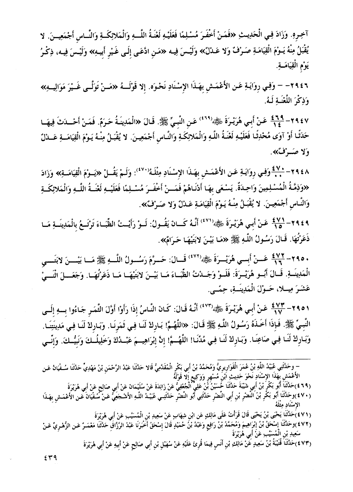 2947 - عن أبي هريرة رضي الله عنه عن النبي صلى الله عليه وسلم. قال "المدينة حرم. فمن أحدث فيها حدثاً أو آوى محدثاً فعليه لعنة الله والملائكة والناس أجمعين. لا يقبل منه يوم القيامة عدل ولا صرف".