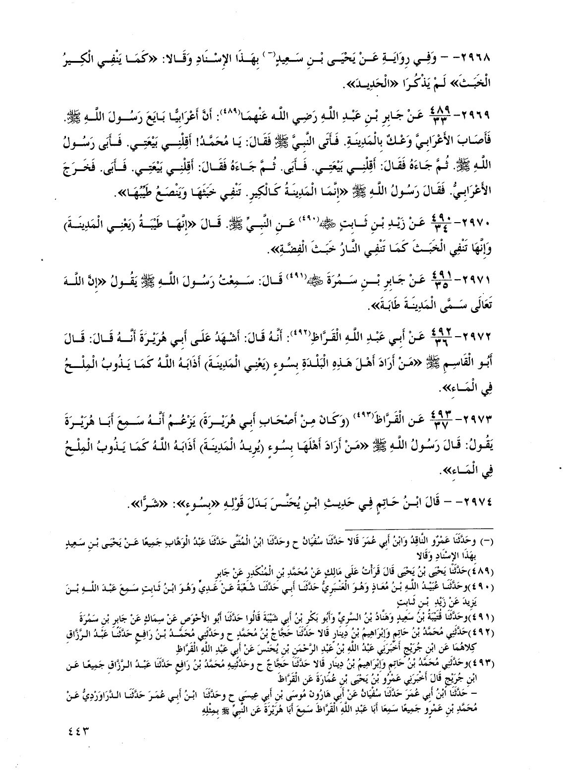 2970 - عن زيد بن ثابت رضي الله عنه عن النبي صلى الله عليه وسلم. قال "إنها طيبة (يعني المدينة) وإنها تنفي الخبث كما تنفي النار خبث الفضة".