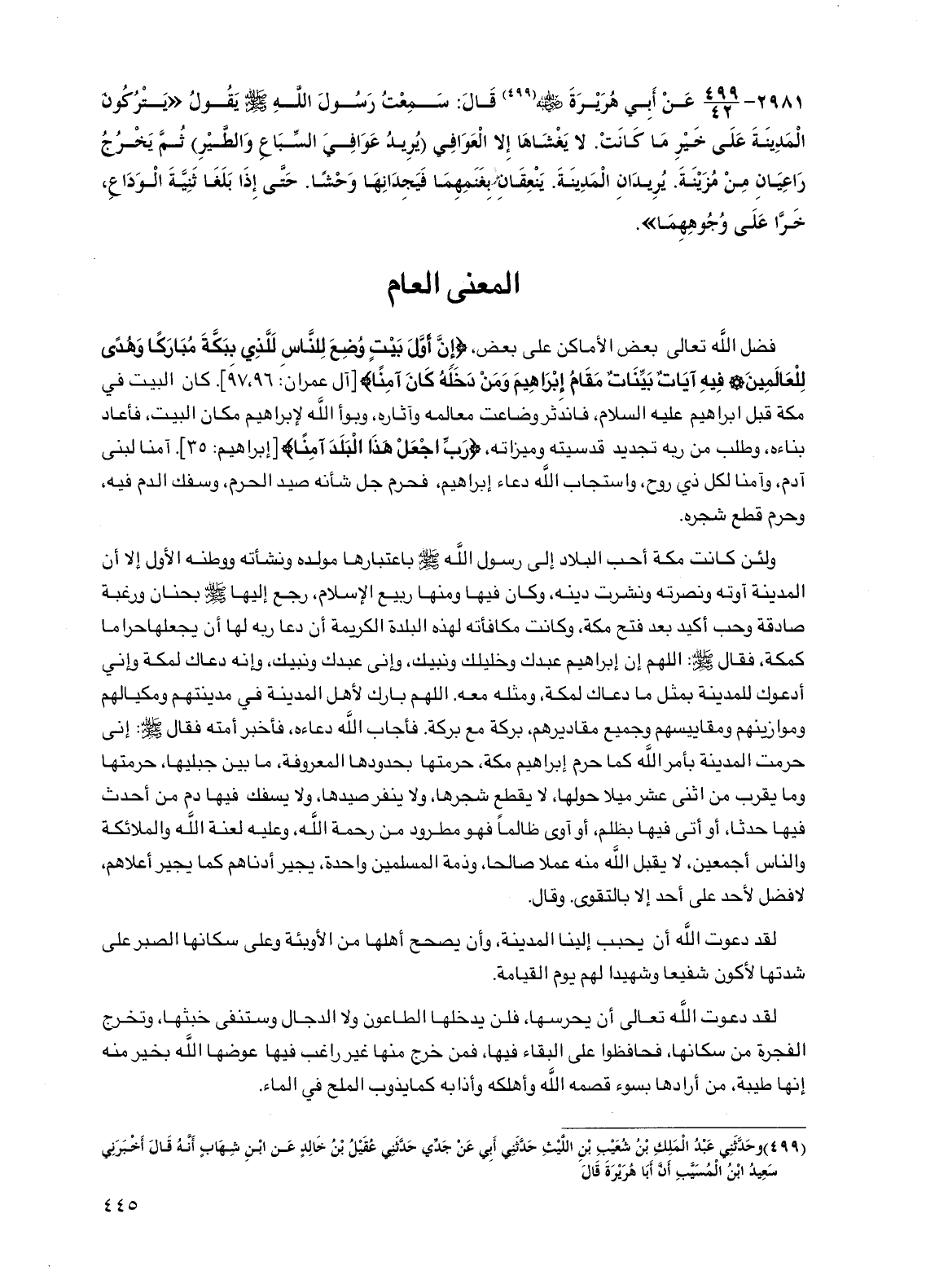 2981 - عن أبي هريرة رضي الله عنه قال: سمعت رسول الله صلى الله عليه وسلم يقول "يتركون المدينة على خير ما كانت. لا يغشاها إلا العوافي (يريد عوافي السباع والطير) ثم يخرج راعيان من مزينة. يريدان المدينة. ينعقان بغنمهما فيجدانها وحشاً. حتى إذا بلغا ثنية الوداع، خرا على وجوههما".