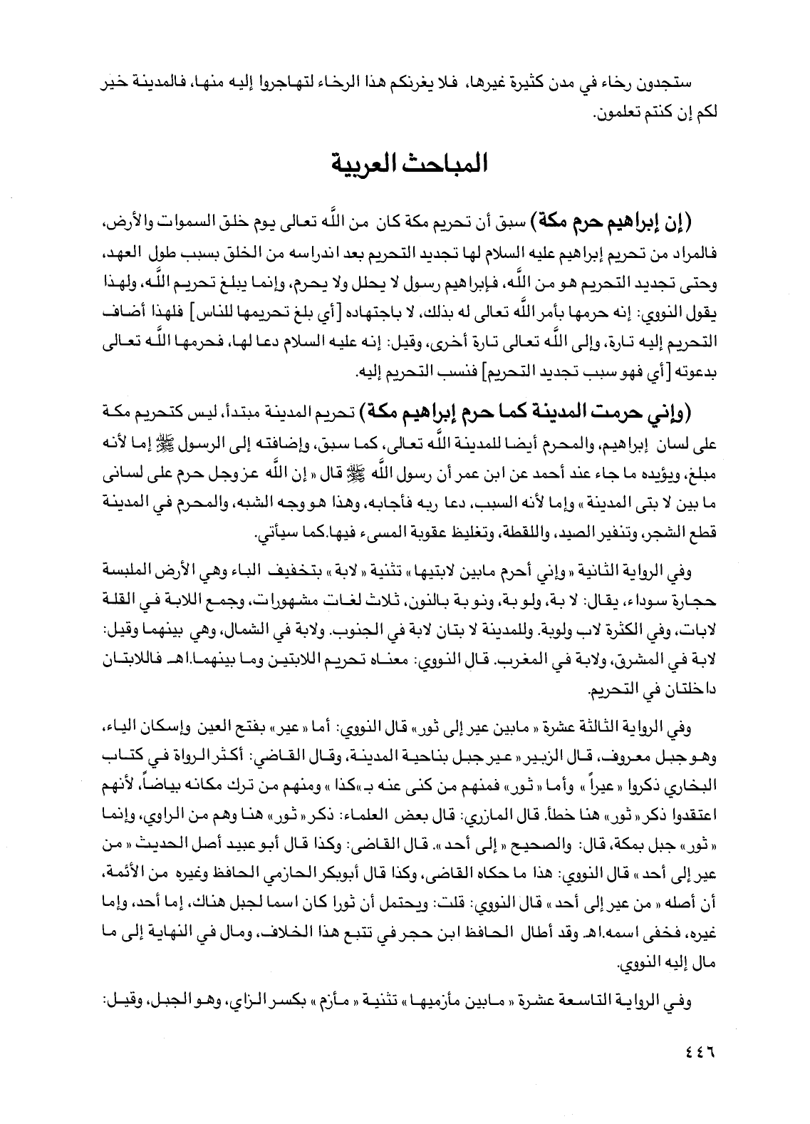 وفي الرواية الثانية "وإني أحرم ما بين لابتيها" تثنية "لابة" بتخفيف الباء وهي الأرض الملبسة حجارة سوداء، يقال: لابة، ولوبة، ونوبة بالنون، ثلاث لغات مشهورات، وجمع اللابة في القلة لابات، وفي الكثرة لاب ولوبة. وللمدينة لابتان لابة في الجنوب. ولابة في الشمال، وهي بينهما وقيل: لابة في المشرق، ولابة في المغرب. قال النووي: معناه تحريم اللابتين وما بينهما. اهـ فاللابتان داخلتان في التحريم.