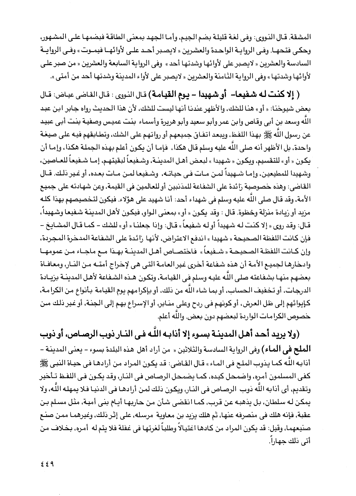 (إلا كنت له شفيعاً -أو شهيداً- يوم القيامة) قال النووي: قال القاضي عياض: قال بعض شيوخنا: "أو" هنا للشك، والأظهر عندنا أنها ليست للشك، لأن هذا الحديث رواه جابر بن عبد الله وسعد بن أبي وقاص وابن عمر وأبو سعيد وأبو هريرة وأسماء بنت عميس وصفية بنت أبي عبيد عن رسول الله صلى الله عليه وسلم بهذا اللفظ، ويبعد اتفاق جميعهم أو رواتهم على الشك، وتطابقهم فيه على صيغة واحدة، بل الأظهر أنه صلى الله عليه وسلم قال هكذا، فإما أن يكون أعلم بهذه الجملة هكذا، وإما أن يكون "أو" للتقسيم، ويكون "شهيداً" لبعض أهل المدينة، وشفيعاً لبقيتهم، إما شفيعاً للعاصين، وشهيداً للمطيعين، وإما شهيداً لمن مات في حياته، وشفيعاً لمن مات بعده، أو غير ذلك. قال القاضي: وهذه خصوصية زائدة على الشفاعة للمذنبين أو للعالمين في القيمة، وعن شهادته على جميع الأمة، وقد قال صلى الله عليه وسلم في شهداء أحد: أنا شهيد على هؤلاء. فيكون لتخصيصهم بهذا كله مزيد أو زيادة منزلة وحظوة. قال: وقد يكون "أو" بمعنى الواو، فيكون لأهل المدينة شفيعاً وشهيداً، قال: وقد روي "إلا كنت له شهيداً أو له شفيعاً" قال: وإذا جعلنا "أو" للشك -كما قال المشايخ- فإن كانت اللفظة الصحيحة "شهيداً" اندفع الاعتراض، لأنها زائدة على الشفاعة المدخرة المجردة، وإن كانت اللفظة الصحيحة "شفيعاً" فاختصاص أهل المدينة بهذا مع ما جاء من عمومها وادخارها لجميع الأمة أن هذه شفاعة أخرى غير العامة التي هي لإخراج أمته من النار، ومعافاة بعضهم منها بشفاعته صلى الله عليه وسلم في القيامة، وتكون هذه الشفاعة لأهل المدينة بزيادة الدرجات، أو تخفيف الحساب، أو بما شاء الله من ذلك، أو بإكرامهم يوم القيامة بأنواع من الكرامة، كإيوائهم إلى ظل العرش، أو كونهم في ردح وعلى منابر، أو الإسراع بهم إلى الجنة، أو غير ذلك من خصوص الكرامات الواردة لبعضهم دون بعض. والله أعلم.