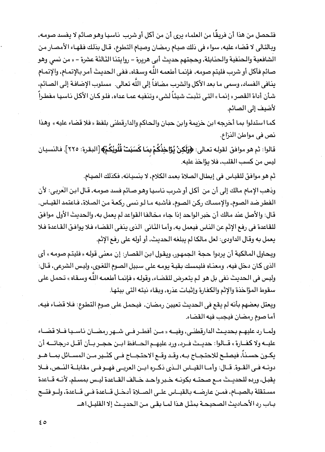 ولما رد عليهم بحديث الدارقطني، وفيه "من أفطر في شهر رمضان ناسياً فلا قضاء عليه ولا كفارة" قالوا: حديث فرد، ورد عليهم الحافظ ابن حجر بأن أقل درجاته أن يكون حسناً، فيصلح للاحتجاج به، وقد وقع الاحتجاج في كثير من المسائل بما هو دونه في القوة. قال: وأما القياس الذي ذكره ابن العربي فهو في مقابلة النص، فلا يقبل، ورده للحديث مع صحته بكونه خبر واحد خالف القاعدة ليس بمسلم، لأنه قاعدة مستقلة بالصيام، فمن عارضه بالقياس على الصلاة أدخل قاعدة في قاعدة، ولو فتح باب رد الأحاديث الصحيحة بمثل هذا لما بقي من الحديث إلا القليل. اهـ