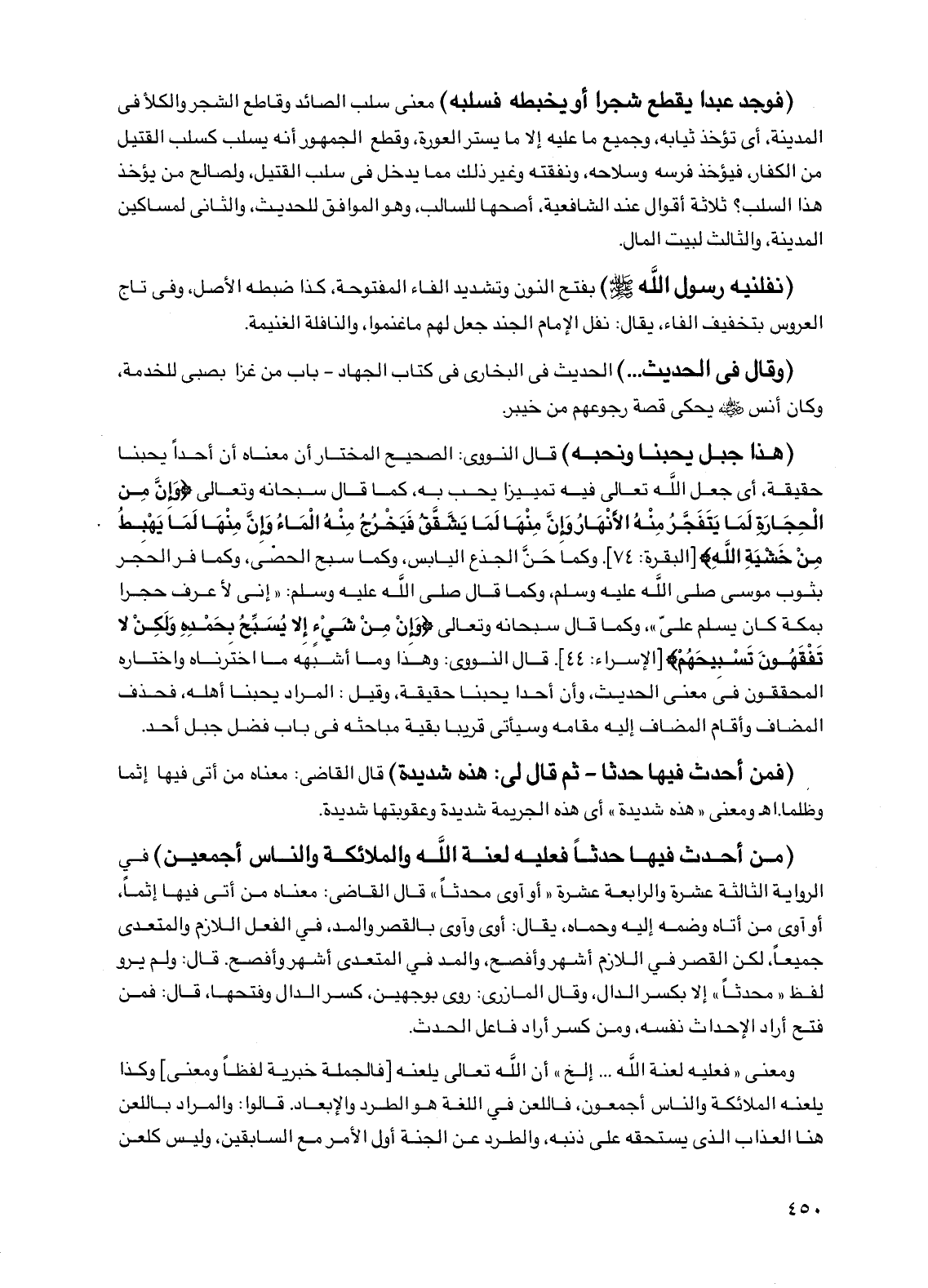 (هذا جبل يحبنا ونحبه) قال النووي: الصحيح المختار أن معناه أن أحداً يحبنا حقيقة، أي جعل الله تعالى فيه تمييزاً يحب به، كما قال سبحانه وتعالى {وإن من الحجارة لما يتفجر منه الأنهار وإن منها لما يشقق فيخرج منه الماء وإن منها لما يهبط من خشية الله} [البقرة: 74]. وكما حن الجذع اليابس، وكما سبح الحصى، وكما فر الحجر بثوب موسى صلى الله عليه وسلم، وكما قال صلى الله عليه وسلم: "إني لأعرف حجراً بمكة كان يسلم علي"، وكما قال سبحانه وتعالى {وإن من شيء إلا يسبح بحمده ولكن لا تفقهون تسبيحهم} [الإسراء: 44]. قال النووي: وهذا ما أشبهه ما اخترناه واختاره المحققون في معنى الحديث، وأن أحداً يحبنا حقيقة، وقيل: المراد يحبنا أهله، فحذف المضاف وأقام المضاف إليه مقامه وسيأتي قريباً بقية مباحثه في باب فضل جبل أحد.