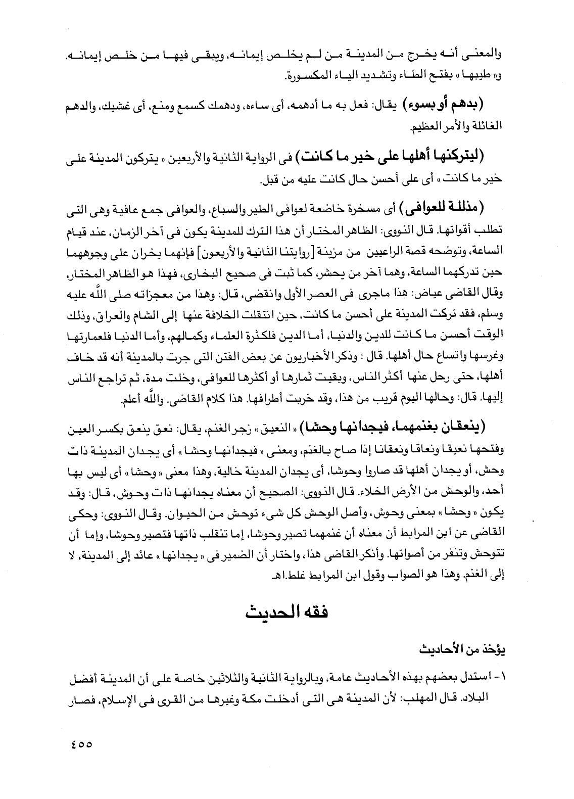 (ينعقان بغنمهما، فيجدانها وحشاً) "النعيق" زجر الغنم، يقال: نعق ينعق بكسر العين وفتحها نعيقاً ونعاقاً ونعقانا إذا صاح بالغنم، ومعنى "فيجدانها وحشاً" أي يجدان المدينة ذات وحش، أو يجدان أهلها قد صاروا وحوشاً، أي يجدان المدينة خالية، وهذا معنى "وحشاً" أي ليس بها أحد، والوحش من الأرض الخلاء. قال النووي: الصحيح أن معناه يجدانها ذات وحوش، قال: وقد يكون "وحشاً" بمعنى وحوش، وأصل الوحش كل شيء توحش من الحيوان. وقال النووي: وحكى القاضي عن ابن المرابط أن معناه أن غنمهما تصير وحوشاً، إما تنقلب ذاتها فتصير وحوشاً، وإما أن تتوحش وتنفر من أصواتها. وأنكر القاضي هذا، واختار أن الضمير في "يجدانها" عائد إلى المدينة، لا إلى الغنم. وهذا هو الصواب وقول ابن المرابط غلط. اهـ