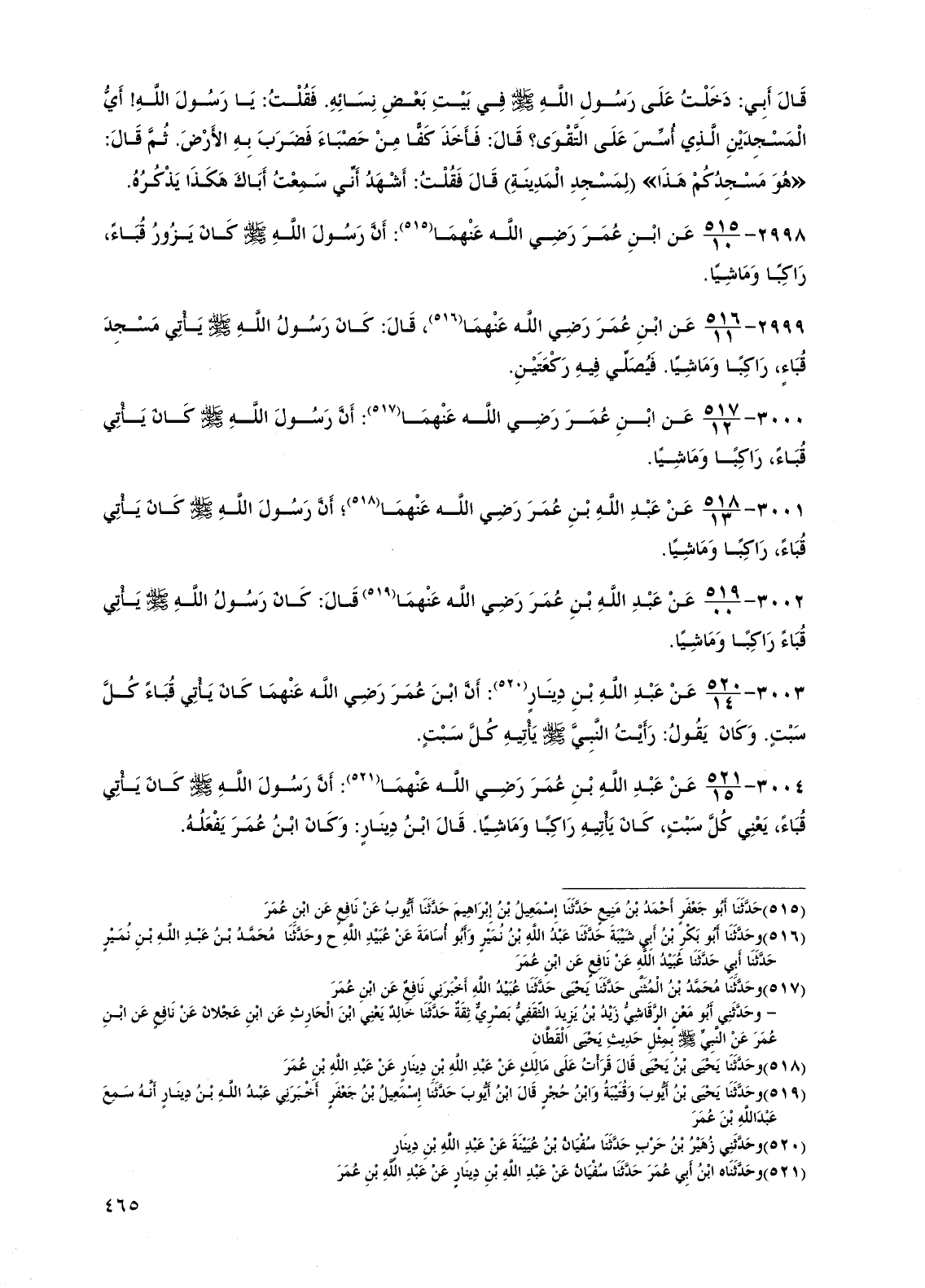3004 - عن عبد الله بن عمر رضي الله عنهما: أن رسول الله صلى الله عليه وسلم كان يأتي قباء، يعني كل سبت، كان يأتيه راكباً وماشياً. قال ابن دينار: وكان ابن عمر يفعله.
