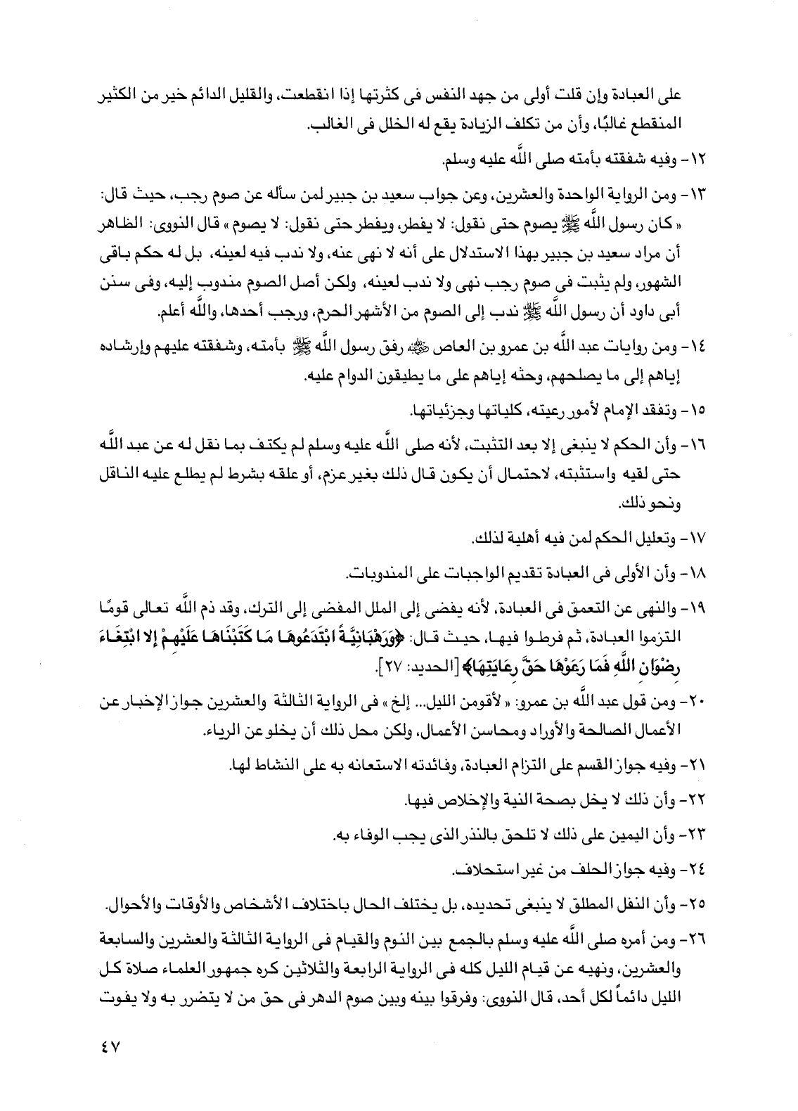26 - ومن أمره صلى الله عليه وسلم بالجمع بين النوم والقيام في الرواية الثالثة والعشرين والسابعة والعشرين، ونهيه عن قيام الليل كله في الرواية الرابعة والثلاثين كره جمهور العلماء صلاة كل الليل دائماً لكل أحد، قال النووي: وفرقوا بينه وبين صوم الدهر في حق من لا يتضرر به ولا يفوت