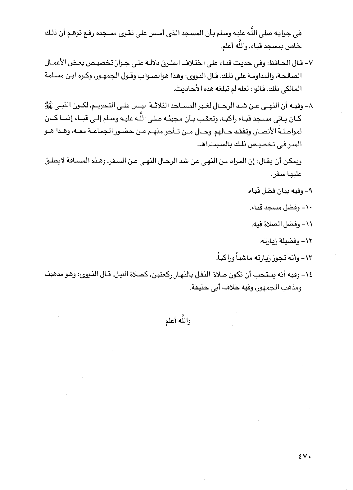 7 - قال الحافظ: وفي حديث قباء على اختلاف الطرق دلالة على جواز تخصيص بعض الأعمال الصالحة، والمداومة على ذلك. قال النووي: وهذا هو الصواب وقول الجمهور، وكره ابن مسلمة المالكي ذلك. قالوا: لعله لم تبلغه هذه الأحاديث.