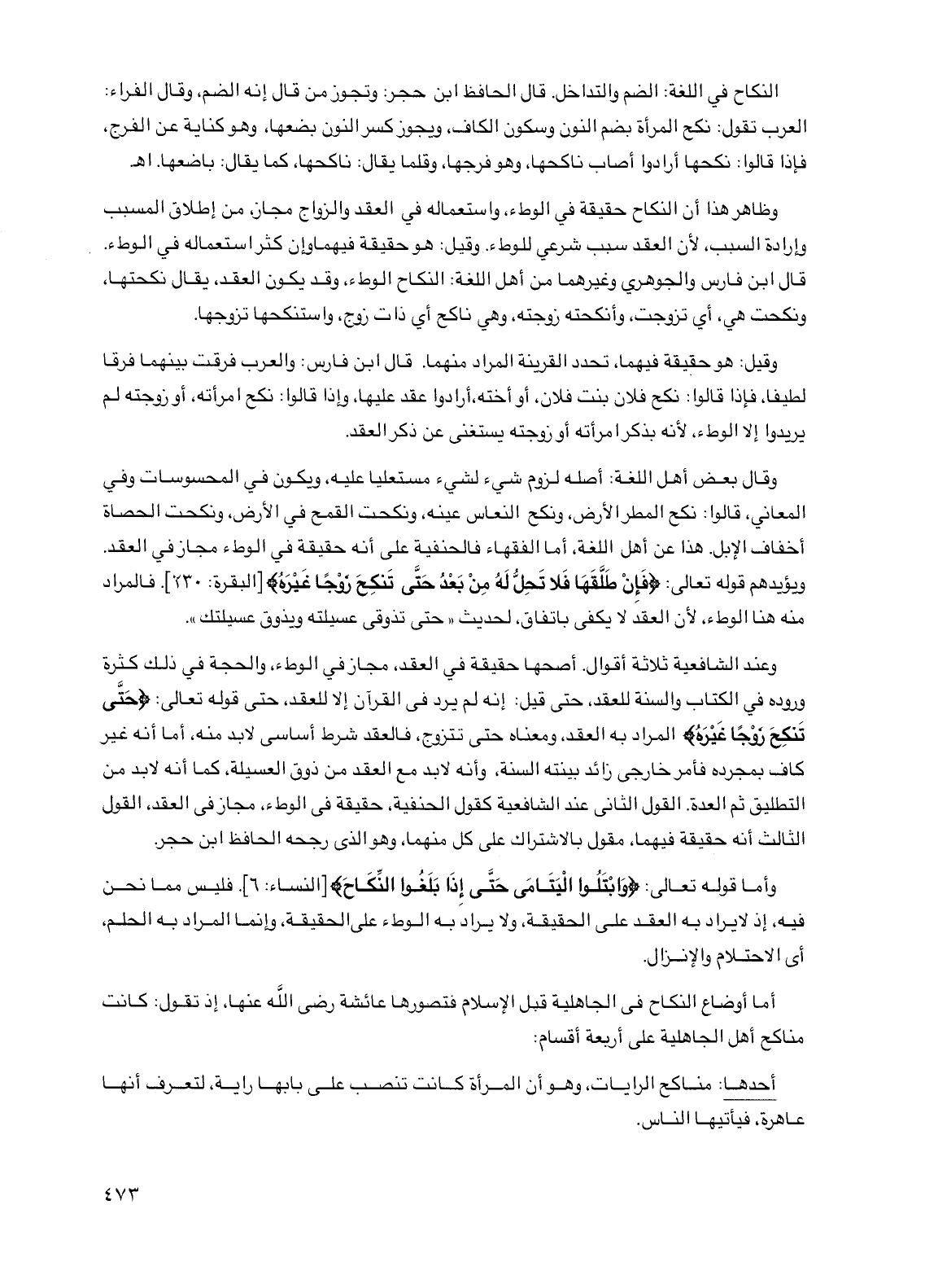 وظاهر هذا أن النكاح حقيقة في الوطء، واستعماله في العقد والزواج مجاز، من إطلاق المسبب وإرادة السبب، لأن العقد سبب شرعي للوطء. وقيل: هو حقيقة فيهما وإن كثر استعماله في الوطء. قال ابن فارس والجوهري وغيرهما من أهل اللغة: النكاح الوطء، وقد يكون العقد، يقال نكحتها، ونكحت هي، أي تزوجت، وأنكحته زوجته، وهي ناكح أي ذات زوج، واستنكحها تزوجها.