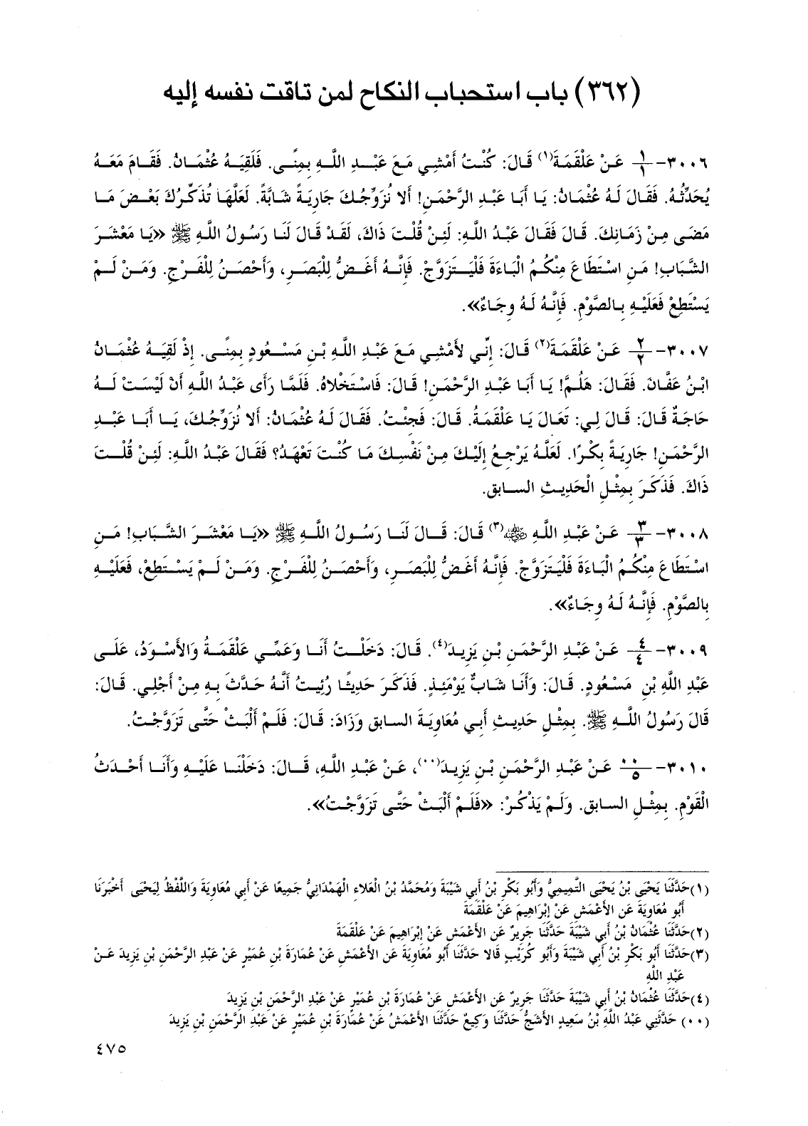 3009 - عن عبد الرحمن بن يزيد. قال: دخلت أنا وعمي علقمة والأسود، على عبد الله بن مسعود. قال: وأنا شاب يومئذ. فذكر حديثاً رئيت أنه حدث به من أجلي. قال: قال رسول الله صلى الله عليه وسلم. بمثل حديث أبي معاوية السابق وزاد: قال: فلم ألبث حتى تزوجت.