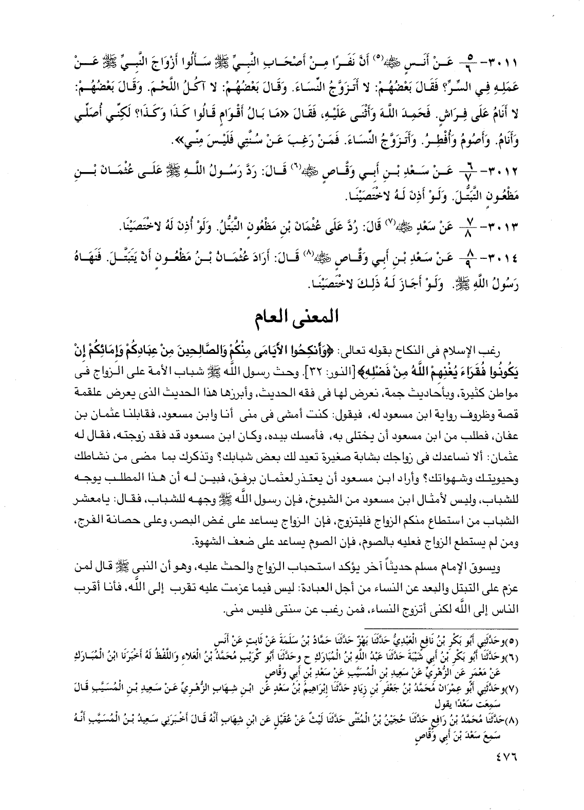 ويسوق الإمام مسلم حديثا آخر يؤكد استحباب الزواج والحث عليه، وهو أن النبي صلى الله عليه وسلم قال لمن عزم على التبتل والبعد عن النساء من أجل العبادة: ليس فيما عزمت عليه تقرب إلى الله، فأنا أقرب الناس إلى الله لكني أتزوج النساء، فمن رغب عن سنتي فليس مني.