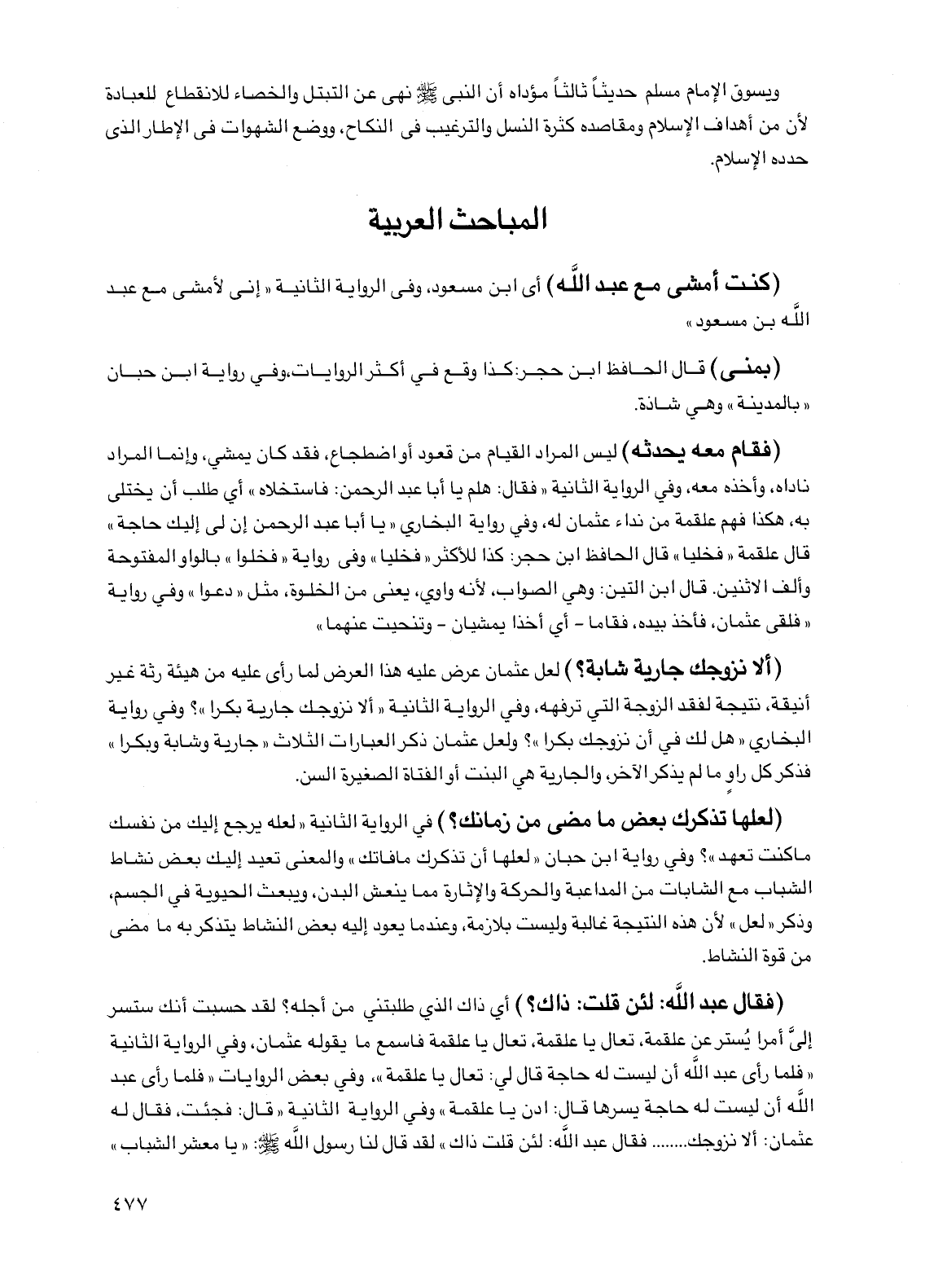 (فقام معه يحدثه) ليس المراد القيام من قعود أو اضطجاع، فقد كان يمشي، وإنما المراد ناداه، وأخذه معه، وفي الرواية الثانية "فقال: هلم يا أبا عبد الرحمن: فاستخلاه" أي طلب أن يختلى به، هكذا فهم علقمة من نداء عثمان له، وفي رواية البخاري "يا أبا عبد الرحمن إن لي إليك حاجة" قال علقمة "فخليا" قال الحافظ ابن حجر: كذا للأكثر "فخليا" وفي رواية "فخلوا" بالواو المفتوحة وألف الاثنين. قال ابن التين: وهي الصواب، لأنه واوي، يعني من الخلوة، مثل "دعوا" وفي رواية "فلقى عثمان، فأخذ بيده، فقاما -أي أخذاً يمشيان- وتنحيت عنهما".