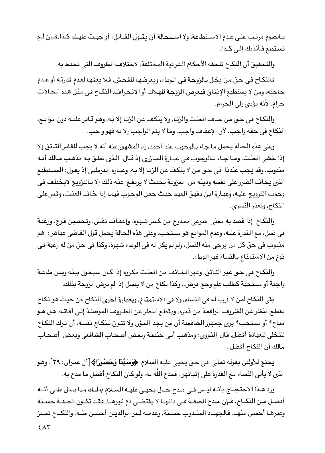 بقي النكاح لمن لا أرب له في النساء، ولا في الاستمتاع، وبعبارة أخرى النكاح من حيث هو نكاح بقطع النظر عن الظروف الرافعة من قدره، وبقطع النظر عن الظروف الموصلة إلى آفاته. هل هو مباح؟ أو مستحب؟ يرى جمهور الشافعية أن من يجد المؤن ولا تتوق للنكاح نفسه، أن ترك النكاح للتخلي للعبادة أفضل. قال النووي: ومذهب أبي حنيفة وبعض أصحاب الشافعي وبعض أصحاب مالك أن النكاح أفضل.