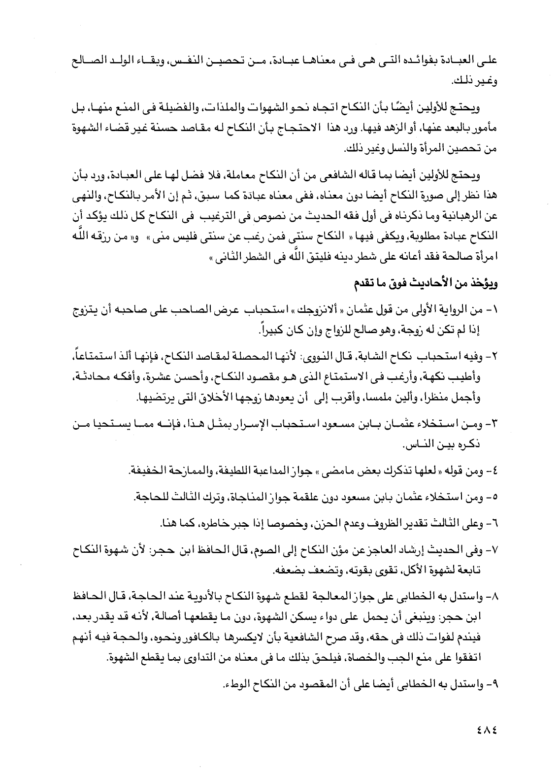 ويحتج للأولين أيضاً بما قاله الشافعي من أن النكاح معاملة، فلا فضل لها على العبادة، ورد بأن هذا نظر إلى صورة النكاح أيضاً دون معناه، ففي معناه عبادة كما سبق، ثم إن الأمر بالنكاح، والنهي عن الرهبانية وما ذكرناه في أول فقه الحديث من نصوص في الترغيب في النكاح كل ذلك يؤكد أن النكاح عبادة مطلوبة، ويكفي فيها "النكاح سنتي فمن رغب عن سنتي فليس مني" و"من رزقه الله امرأة صالحة فقد أعانه على شطر دينه فليتق الله في الشطر الثاني".