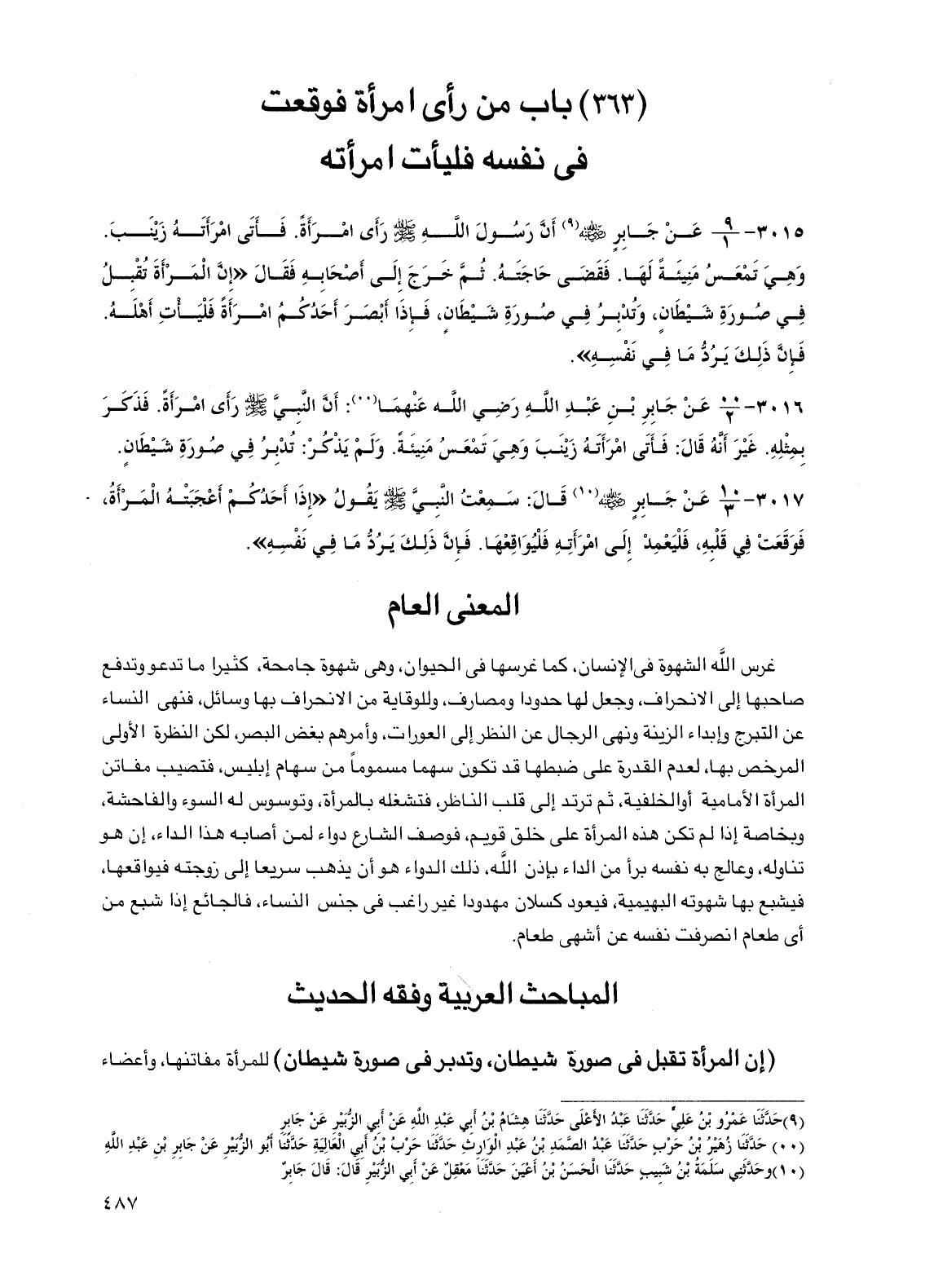 3015 - عن جابر رضي الله عنه أن رسول الله صلى الله عليه وسلم رأى امرأة. فأتى امرأته زينب. وهي تمعس منيئة لها. فقضى حاجته. ثم خرج إلى أصحابه فقال "إن المرأة تقبل في صورة شيطان، وتدبر في صورة شيطان، فإذا أبصر أحدكم امرأة فليأت أهله. فإن ذلك يرد ما في نفسه".